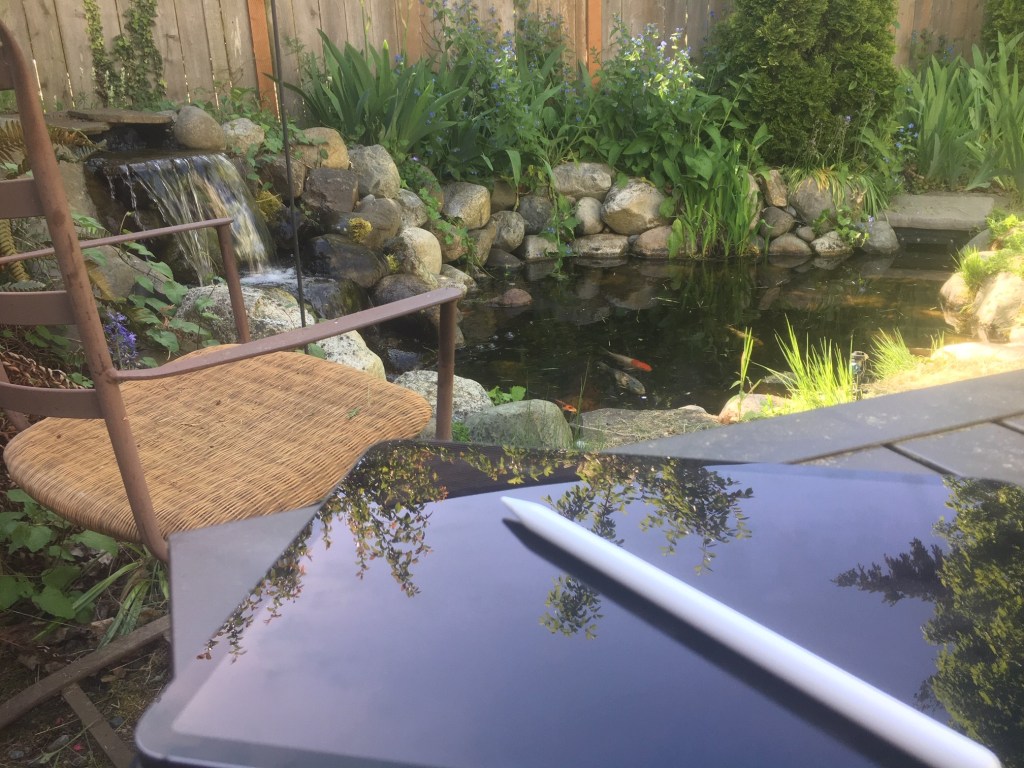 By afternoon, the garage provided shade to the table and chairs by our koi pond. I love the sound of falling water. I found myself getting distracted as the fish splashed about but I managed to finish page 5 before the battery icon on my iPad called for more power.