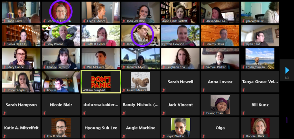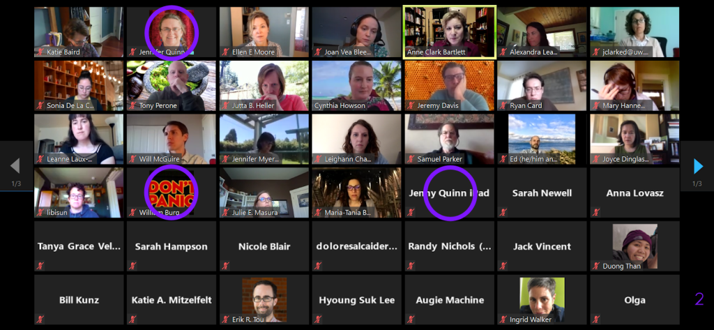 Results. Based on the first image, I should have been the tenth person with an active camera when I joined the meeting. In the second image, the black box “Jenny Quinn’s iPad” is the first position after the active feed. And in the third image, with the camera back on, I moved to the end of the active line. There is one static box (Will Burghart’s Don’t Panic image) ahead of me in the line of active camera feeds in image 2. You can see from the yellow box around Will’s avatar that he was speaking in the first screenshot so perhaps that gives him precedence over people with newly turned on cameras. I observed Sarah Hampson turn on her camera and pop in front of my black box between image 2 and image 3. I continued testing and monitoring throughout the meeting and I believe that the hypothesis above is close but it doesn’t take into account how the use of microphones impacts placement (or for how long).