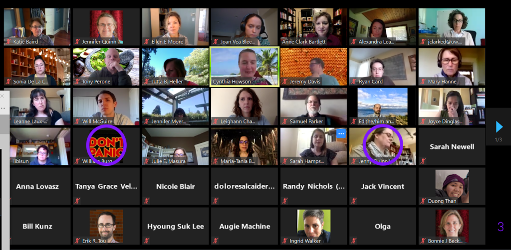 Empirical Testing. My mission at the next large faculty zoom meeting was to pay particular attention to placement in the gallery view as I (and others) turned on and off cameras. I signed into the meeting on two devices: my computer and my iPad. The meeting had nearly 100 participants, so I hoped no one would detect or be bothered by my experimentation. I muted the camera on my computer and you can clearly see the same avatar in the second position of every image below. I took screen shots on my computer while I toggled the iPad camera on and off. Some results are presented in the gallery below.