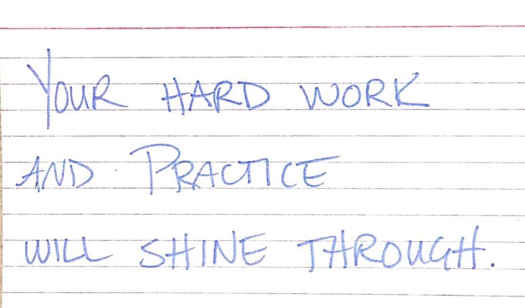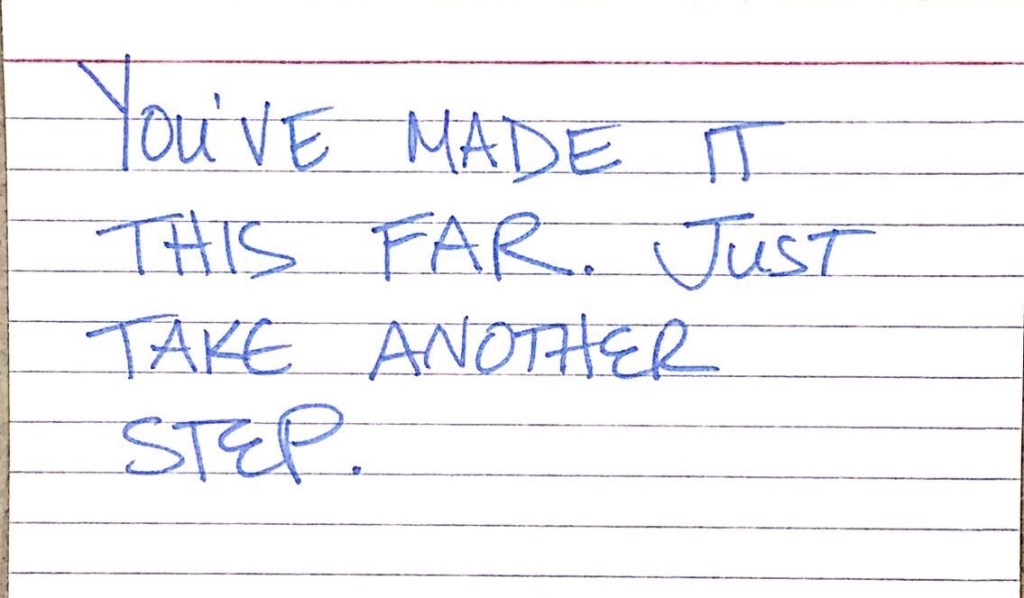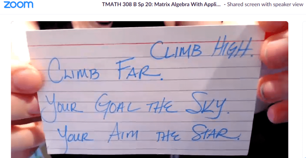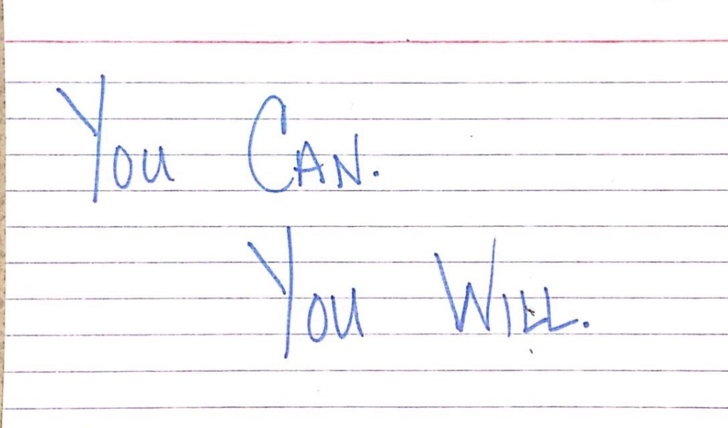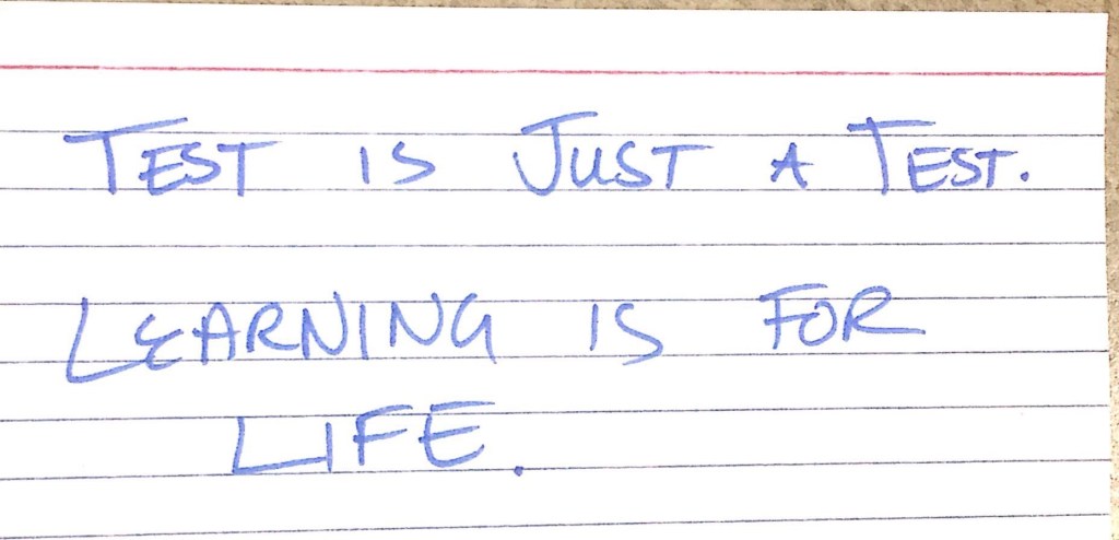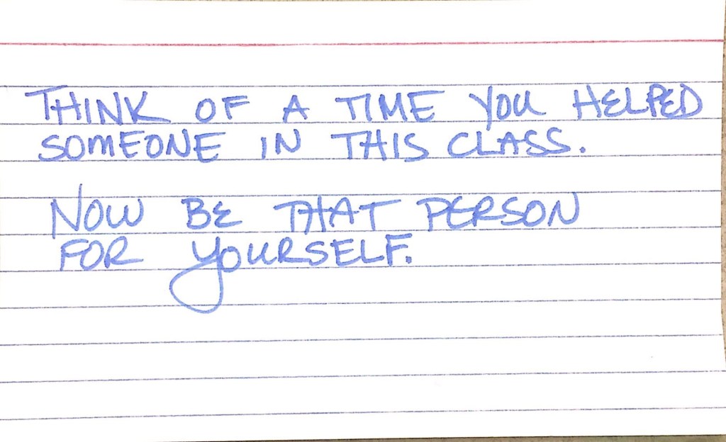 Students randomly selected an index card from the prewritten affirmations and placed it face up as they took the test. The energy in the room changed for the better and anecdotally, many students got exactly the affirmation they needed. “Climb high. Climb Far…” was her affirmation from that day. She saved it, typed it in the Google doc, and showed the original card still in her possession after almost 4 months.