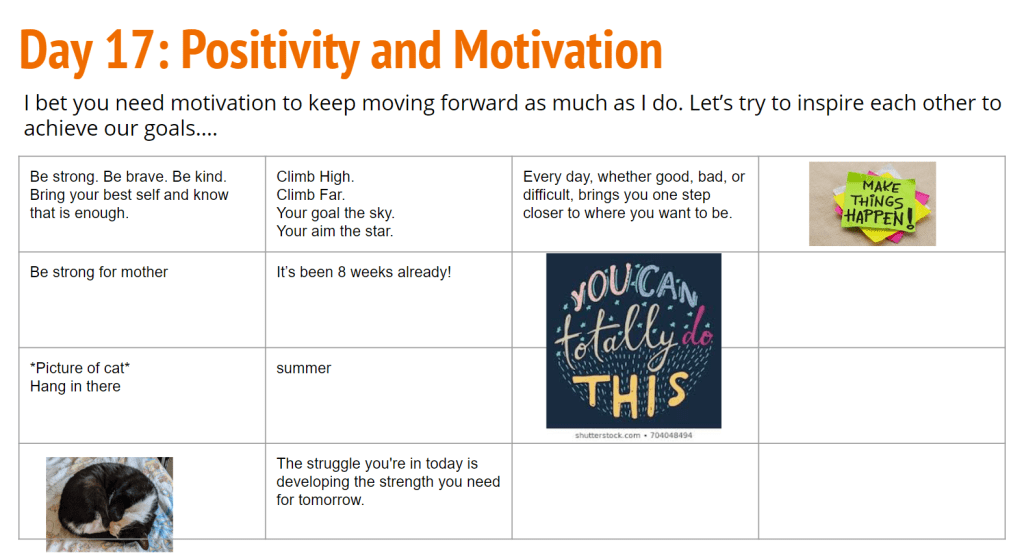 Students were asked to share motivational thoughts, quotes, or memes. Not everyone participated but it brightened my spirits and I hope theirs.
