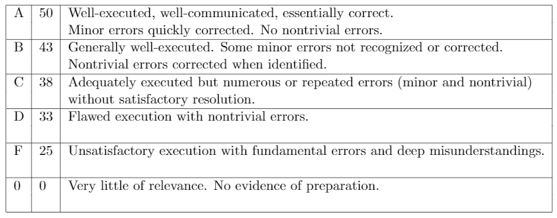 Each student had 20 minutes to present two questions, the first question being their choice and the second was mine. Questions were graded holistically out of 50 points modeled on a rubric from Boedigheimer, Ghrist, Peterson, and Kallemyn in “Individual Oral Exams in Mathematics Courses: 10 Years of Experience at the Air Force Academy,” PRIMUS, Volume 25, 2015 – Issue 2.