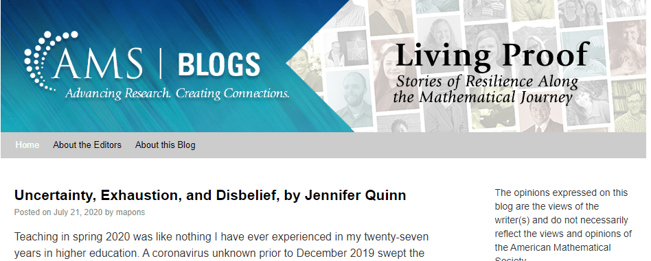 Because of this blog, I was asked by Allison Henrich and Matthew Pons with write a post for the AMS blog Living Proof: Stories of Resilience along the Mathematical Journey about my challenges and struggles teaching through the COVID-19 pandemic.