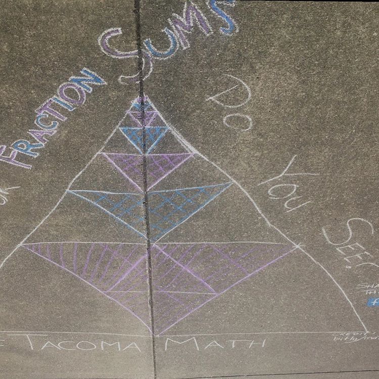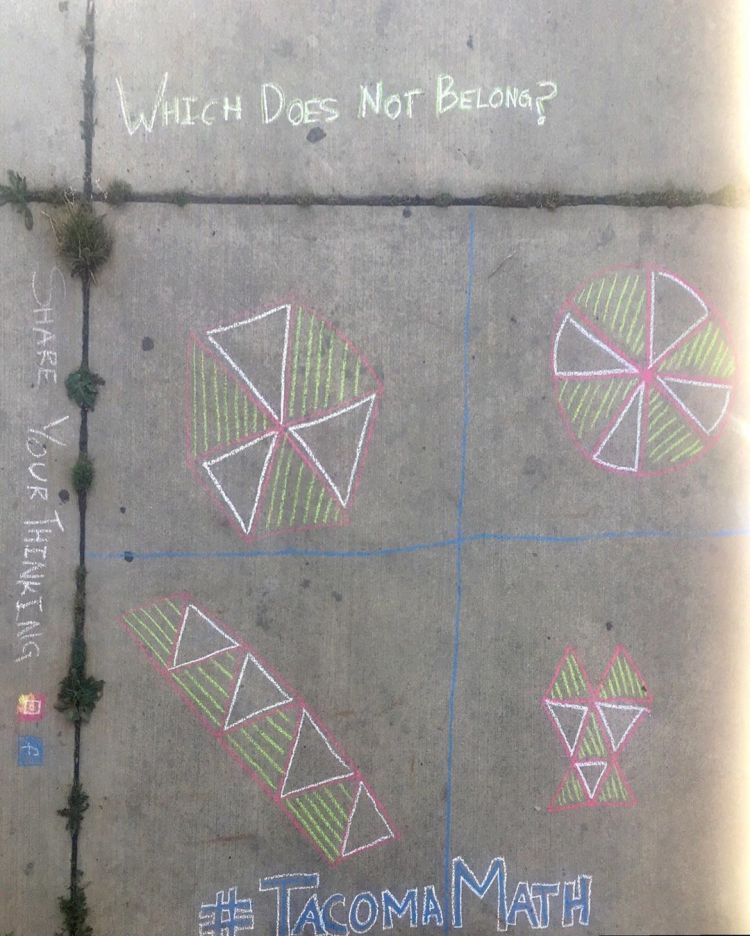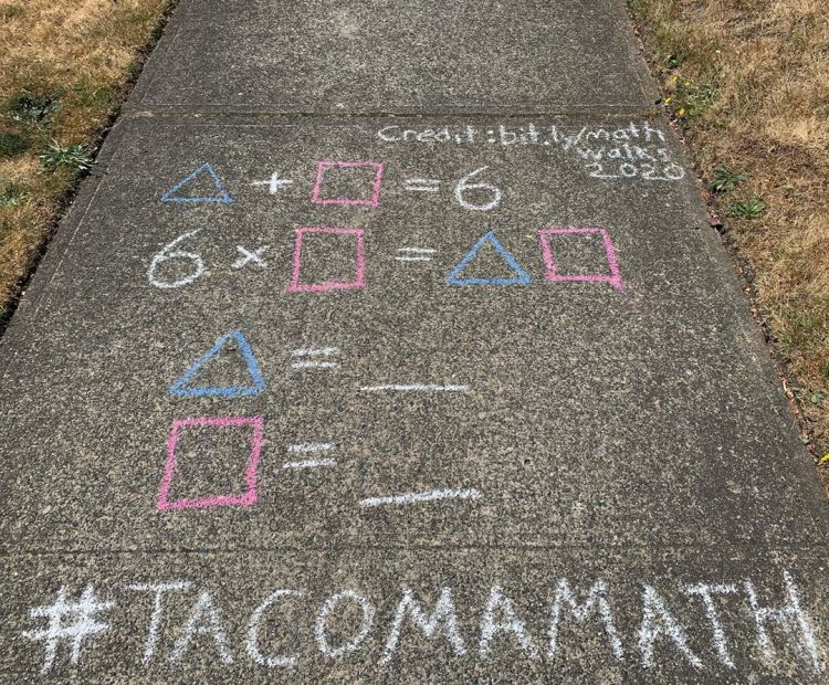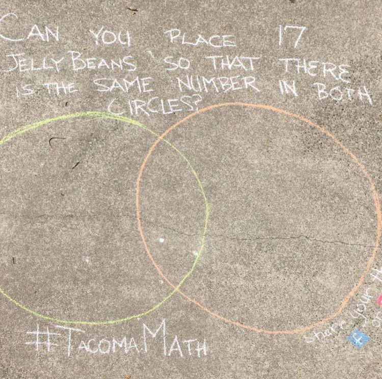 Sidewalk Chalk Puzzlers are inspired by Traci Jackson (@traciteacher). The idea is to seed Tacoma with chalked puzzles and crowd source more puzzles until we fill up this town. People can copy an existing puzzle to a new location, select a puzzle from bit.ly/mathwalks2020 (please be sure to include the source), or create one of their own. The hope is to generate curiosity and discussion. We are asking people to post their puzzlers or thinking on Instagram/FB with the hashtag #TacomaMath. (A feed of Instagram posts with #TacomaMath can be found at graduatetacoma.org/tacomamath.)