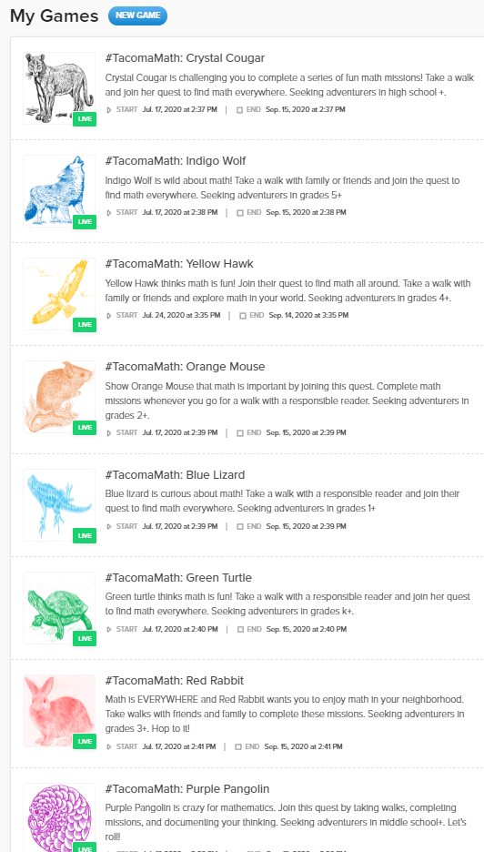There are eight different levels from kindergarten to high school. They can be used as discussion prompts on family walks with younger mathematicians or individual/ small group activities to get older mathematicians out of the house, away from their computers, and off your back for a little while. Each quest has an animal avatar, multiple missions, and grade appropriate content. Participants earn points for photo or text contributions. We hope it reinforces that mathematics is more than arithmetic. It is fun, beautiful, and EVERYWHERE.