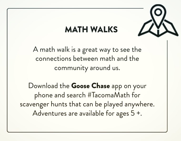 Math Walks are guided quests on the Goose Chase app that can be completed almost anywhere—in your home, neighborhood, or local park. There is nothing uniquely Tacoma about it, except that we created them for the students of Tacoma.