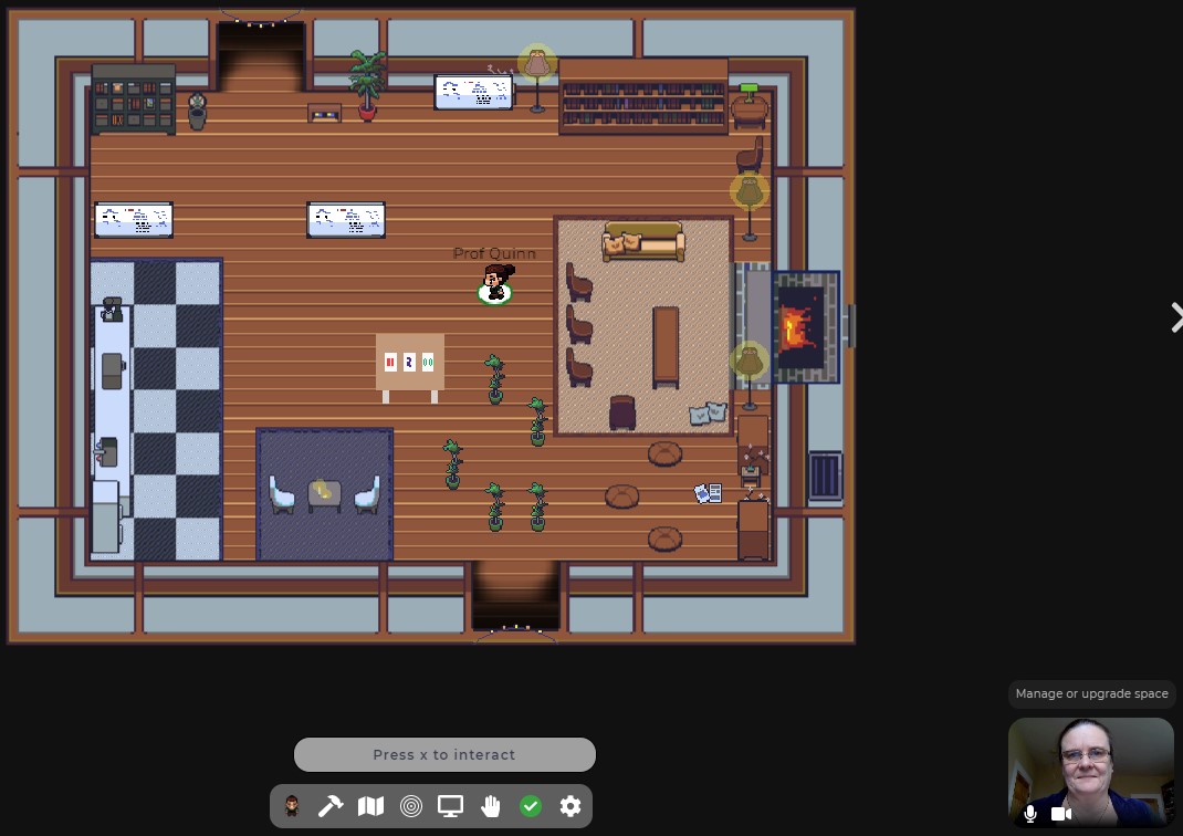 I’m experimenting with virtual office hours this quarter. I wanted to reproduce the casual mingling that happens during my person-to-person drop-in hours at the UW Tacoma Teaching and Learning Center (TLC). I like the ability to wander around and eavesdrop on conversations. So after learning about Gather (gather.town), I decided to give it a go.