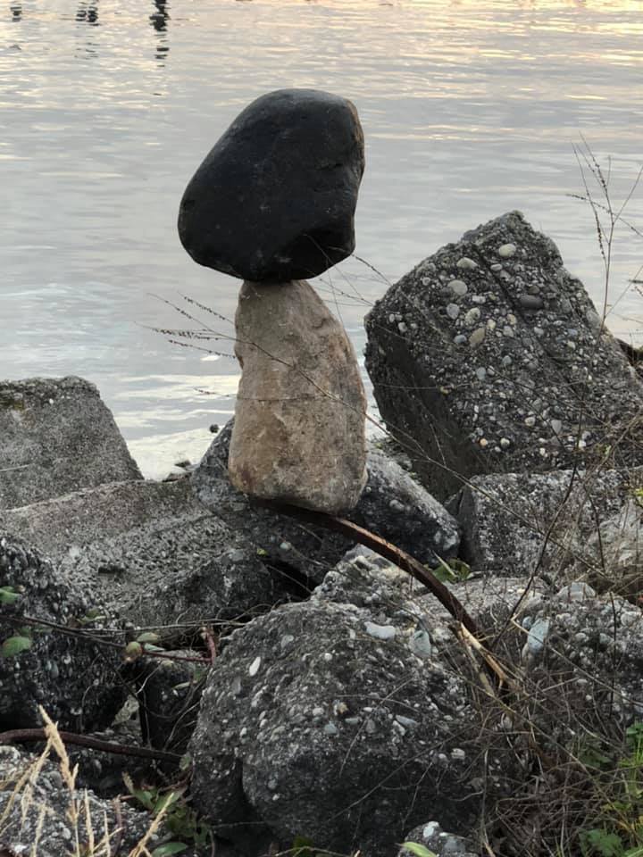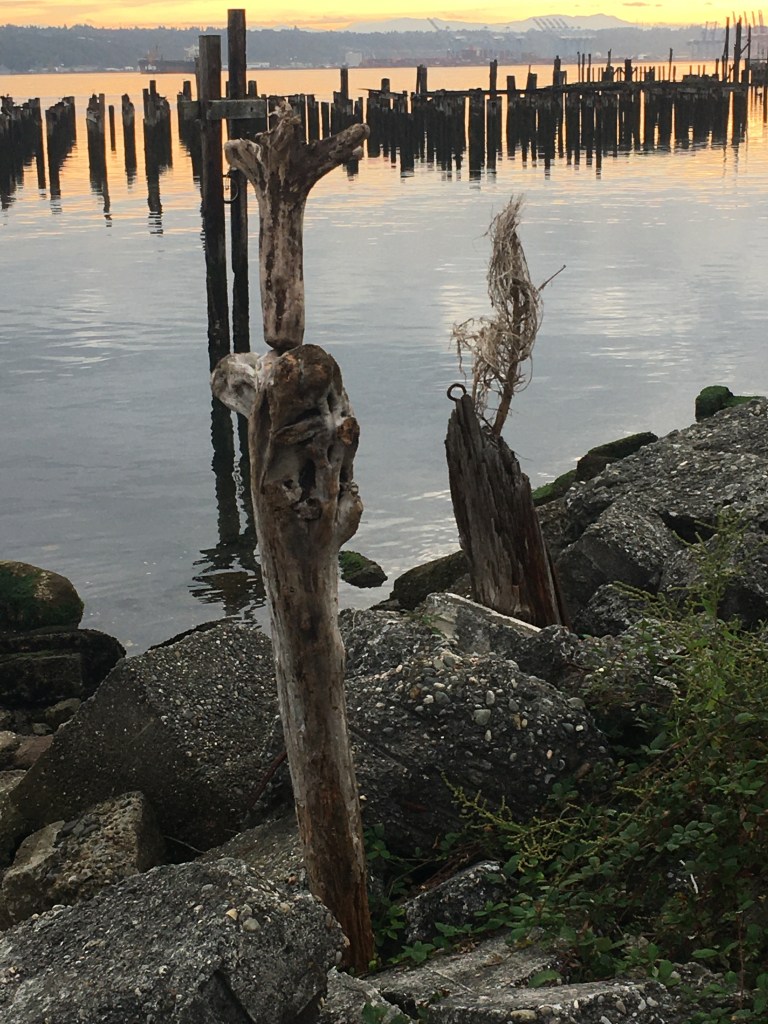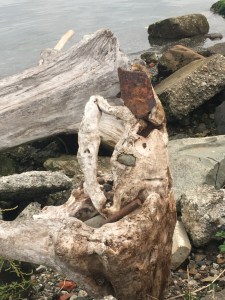 I questioned whether it was my mind trying to put order onto a random assemblage or it was a purposeful placement. A closer look along the waterfront revealed more natural-but-unlikely structures. The impossibly balanced limbs and stones, together with rebar all in close proximity, must mean someone has been busy. I wonder who?