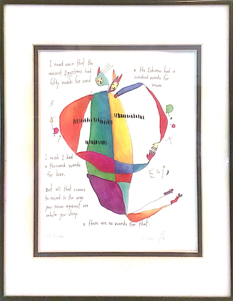 The eroded metal looked like a face, the embedded rock a heart, and the roots an embrace. It reminded me of a monochrome version of classic works by the artist formerly known as Brian Andreas (now Kai Skye.) In particular, “No Words” (2000) seemed to mirror the tilt of the head, the angle of the embrace, and the legs off to the side.