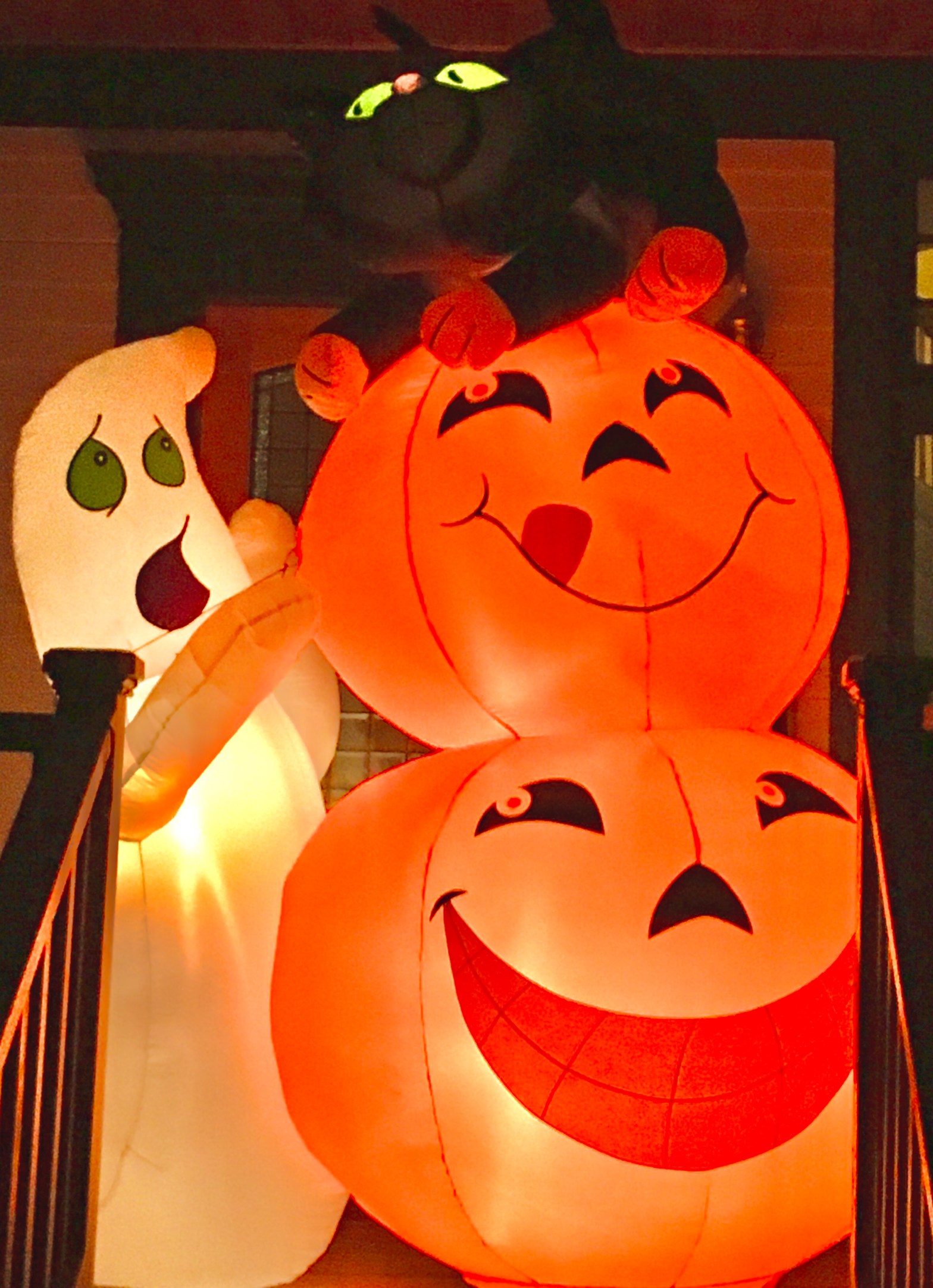 No trick-or-treaters here. Blocked the porch on purpose. Heard mirthful laughter. Across the street, a neighbor had a fire pit, glowing pumpkins, and a candy chute down to the sidewalk. Pretty awesome.