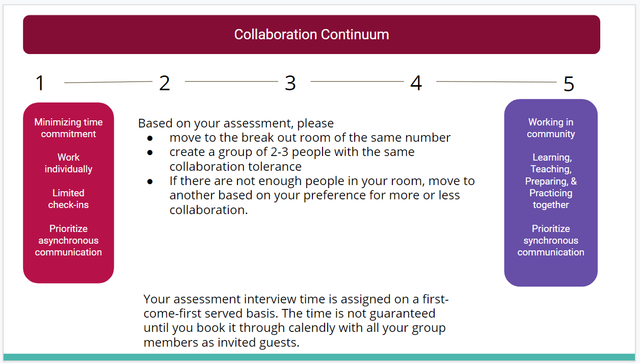 The late night revisions were implemented. Every person that attended class successfully self-selected a group with similar collaboration tendencies and booked an interview time for next week. They traded contact information and spent over sixty minutes working together. The sound level in low numbered rooms was less than that in the higher numbered rooms, asContinue reading “October 21 Day 227: Collaboration Continuum”