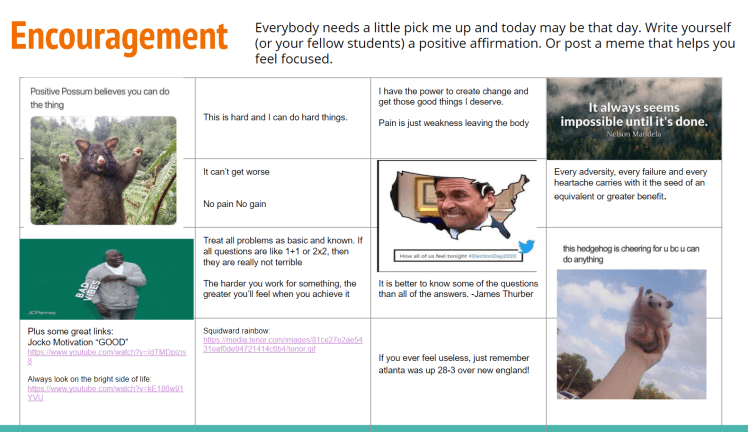 Right now this country is divided. Let’s work to keep our class a place where we come together, regardless of difference, to support one another on our educational journeys. I try to remember these words that I wrote March 13, after only one week of remote emergency instruction: