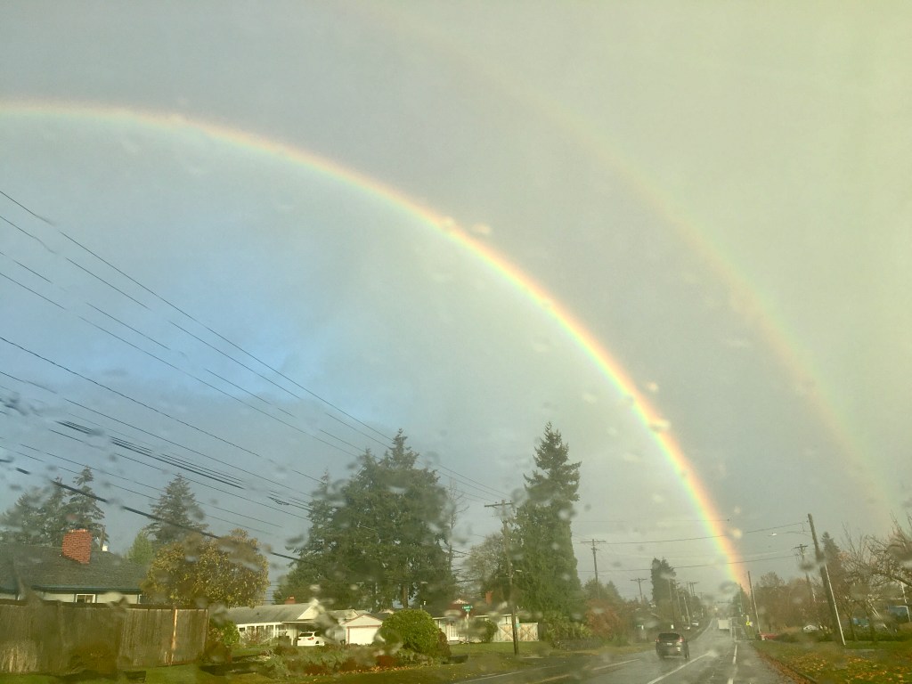 Addition: An hour later, I was driving in the car and got treated to the full arch double rainbow. Those of you that know Tacoma understand the right side is terminating near (I’d like to think on) my house.