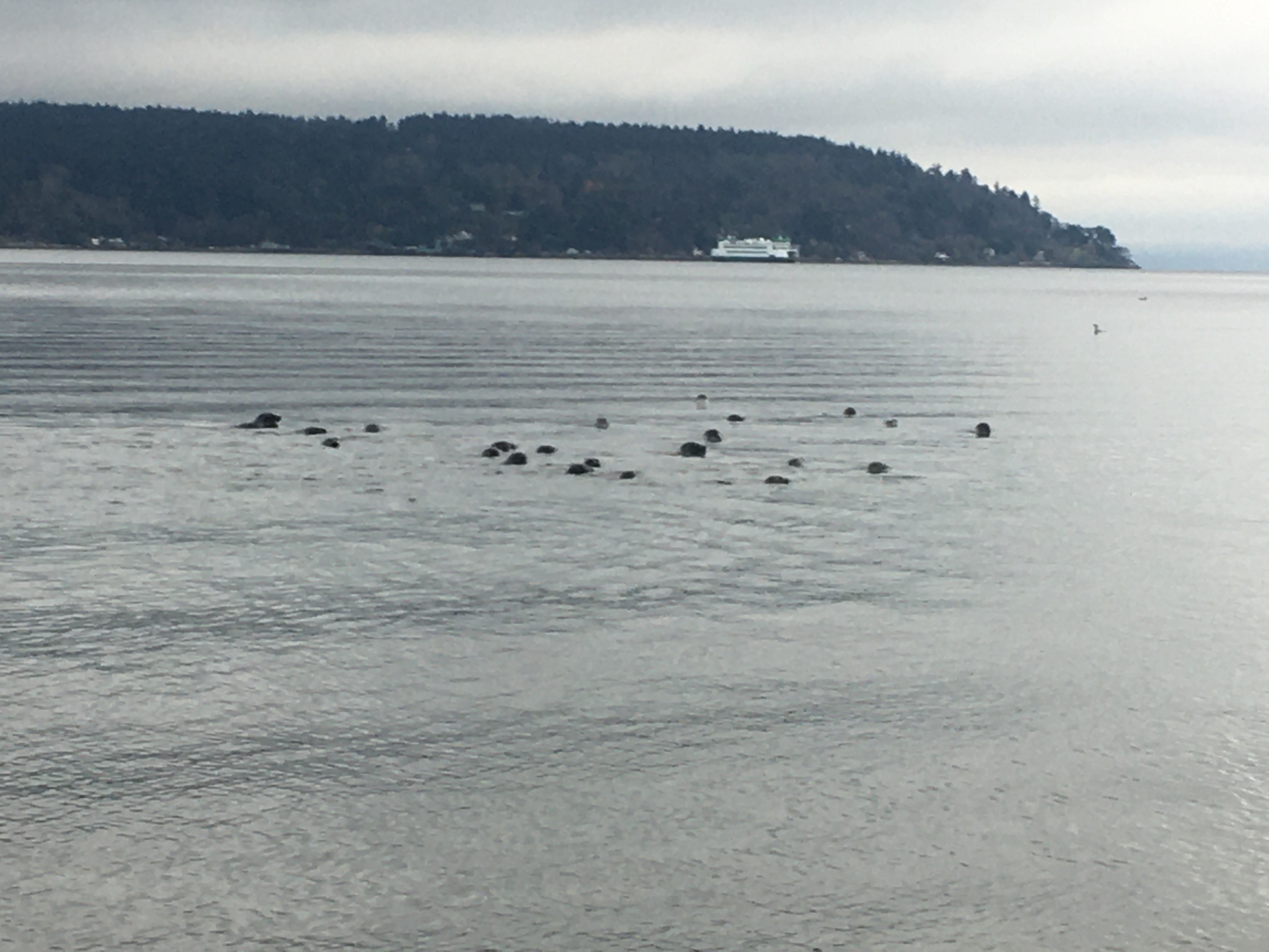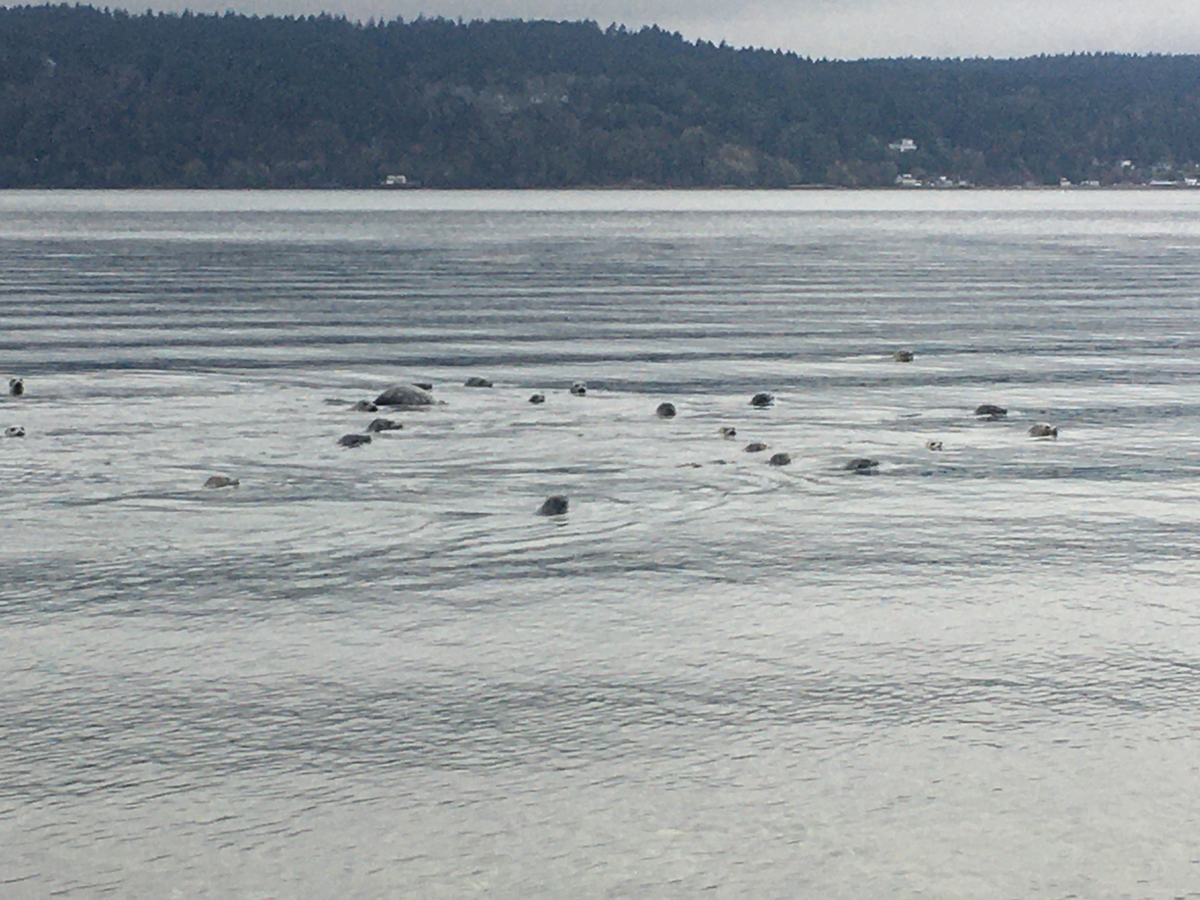 I asked Mark if those dots in the distance were a flock of birds. As they came closer, it became clear it was an entire bob of seals. They swam past us heading towards the marina.
