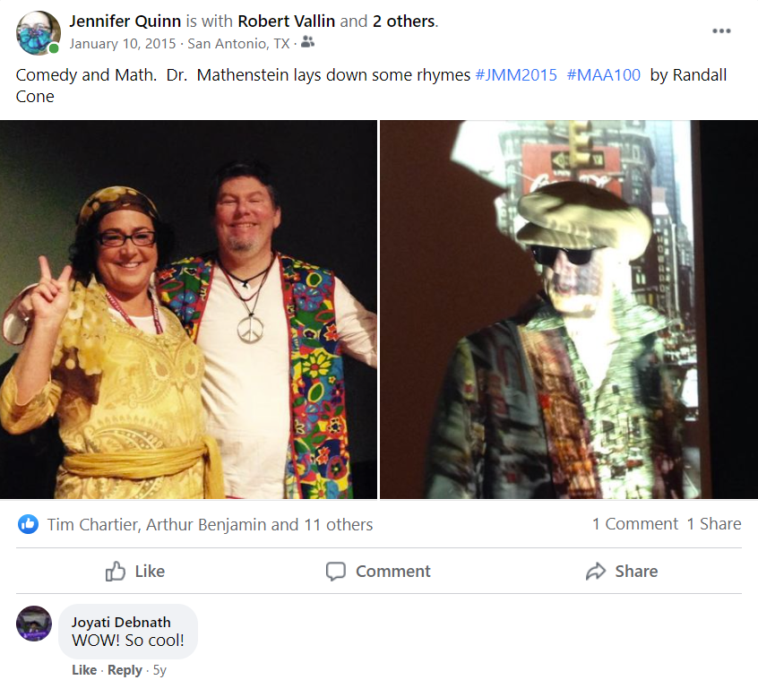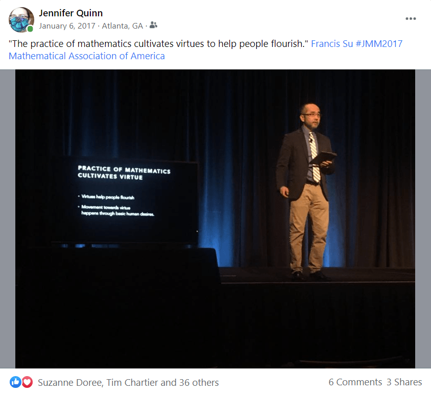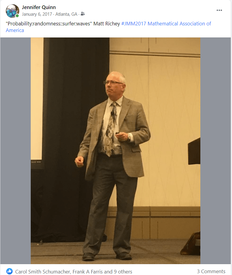 2013: San Diego. My first JMM as 2nd VP of MAA. I introduced Tim Chartier’s invited talk. I think I worked harder on his introduction than some talks I have given. I called him a “hyper competent individual—uniquely balancing his creative energies as a teacher, researcher, writer, and artist.” It was also the meeting where Francis Su gave his Haimo Award presentation “The Lesson of Grace in Teaching.”