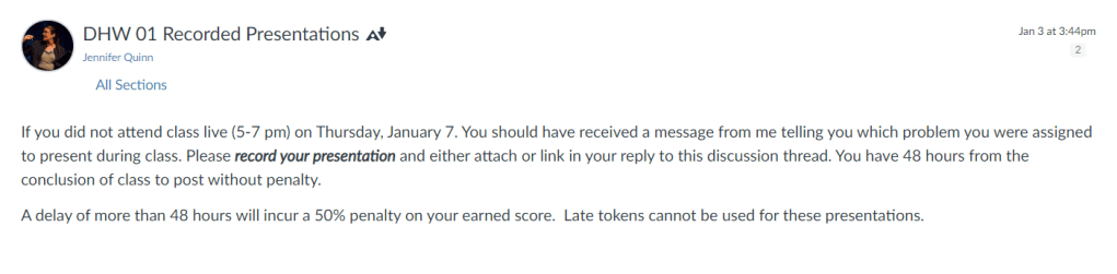 I can confirm that the promised message was emailed on Thursday evening. I received two “submissions”—one a link to a zoom recording and the other a pdf file and png picture but no recording. Neither was uploaded to the discussion board as requested but sent through the course management system mail client.