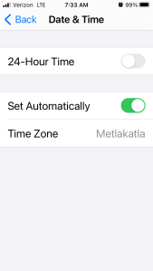 My iPhone and iWatch were both displaying the same time. I immediately searched for the correct time. It was 8:30 am not 7:31 am as my phone told me (image on left). Then I opened Settings > General > Date and Time. And I saw the image on the right: