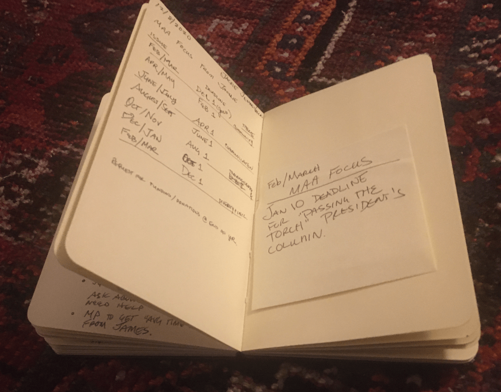 For the past year I have been meeting regularly with the executive director Michael Pearson and president Michael Dorff. I scribbled notes, asked questions, and added my 2 cents worth to topics of the moment. Afterwards, I carefully summarized my important learnings in one or two pages of a small black moleskin notebook.