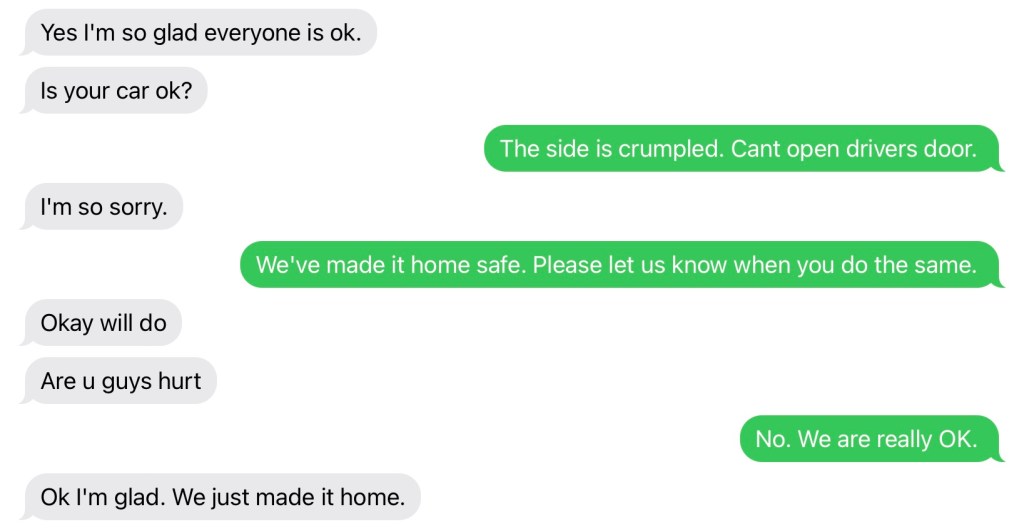 Everyone involved was kind. Zachary waited for a clear opening and ran to check on the people in the other car. We were all shaken but so far seemed alright. He got their phone number and we communicated by text. I called 9-1-1; we waited.