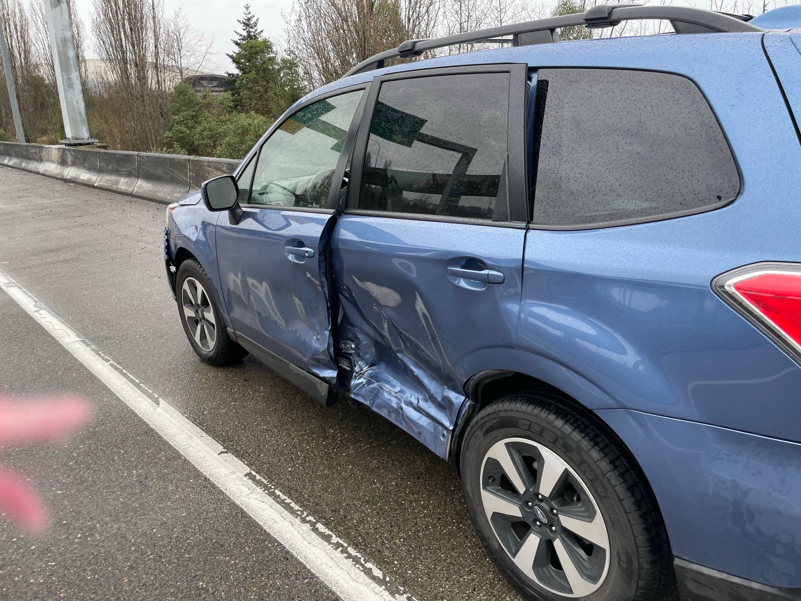 As we entered I-705 from the 7 extension near the Tacoma Dome, a vehicle from the I-5 N ramp blew a front tire and collided with us.