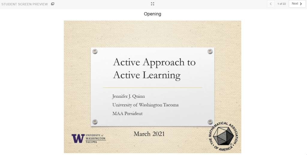 Presentation #1: An Active Approach to Active Learning for the Missouri MAA Section NExT participants.