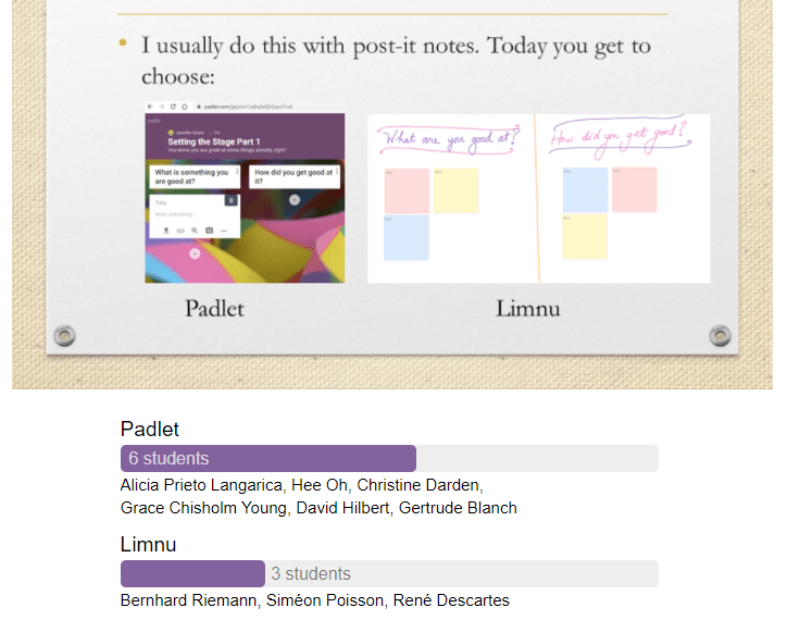Notice the anonymized names are mathematicians. Some are classical. Some are current. You know you have reached the pinnacle of success when your name is used to anonymize users in Desmos! As you can see, the group chose padlet—mostly because it was new to the crowd, because it is a free tool, and maybe because it was the most colorful.