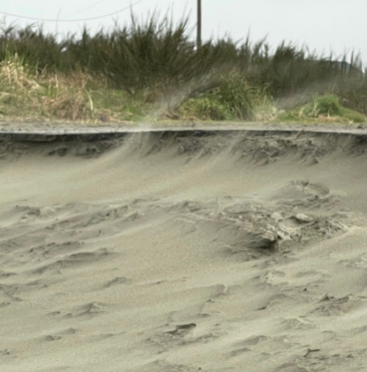 Weather did not cooperate as it was extremely windy at the Pacific Ocean. Sand streamed along the beach, making visible the steady air currents swirling around legs and over objects.