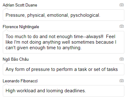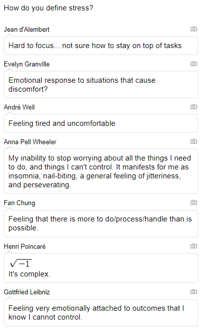 Nobody appeared in the third quadrant—low stress, low energy. Most participants are experiencing moderate to high stress and their energy levels are all over the place. We asked participants how they defined stress. Perhaps you relate to some of the (anonymized) responses:
