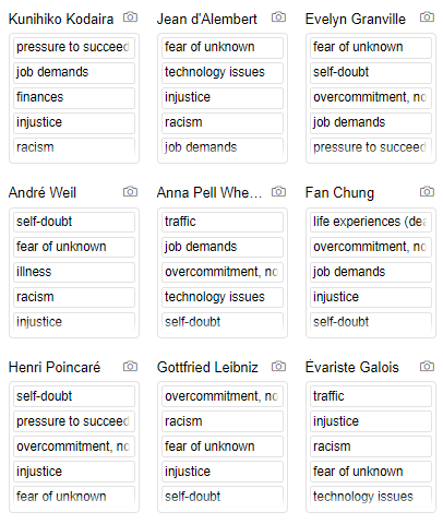 And I chose to include eight cards because of their connection to the session. Nalini Joshi, Zaha Hadid, and Sophie Germain because the artists of their cards were present; Fan Chung and Florence Nightingale because they were in attendance (as anonymized names); Julia Robinson since Nancy Blachman, founder of the Julia Robinson Festival was present; and Hortensia Soto and Deanna Haunsperger because of their leadership in the MAA.