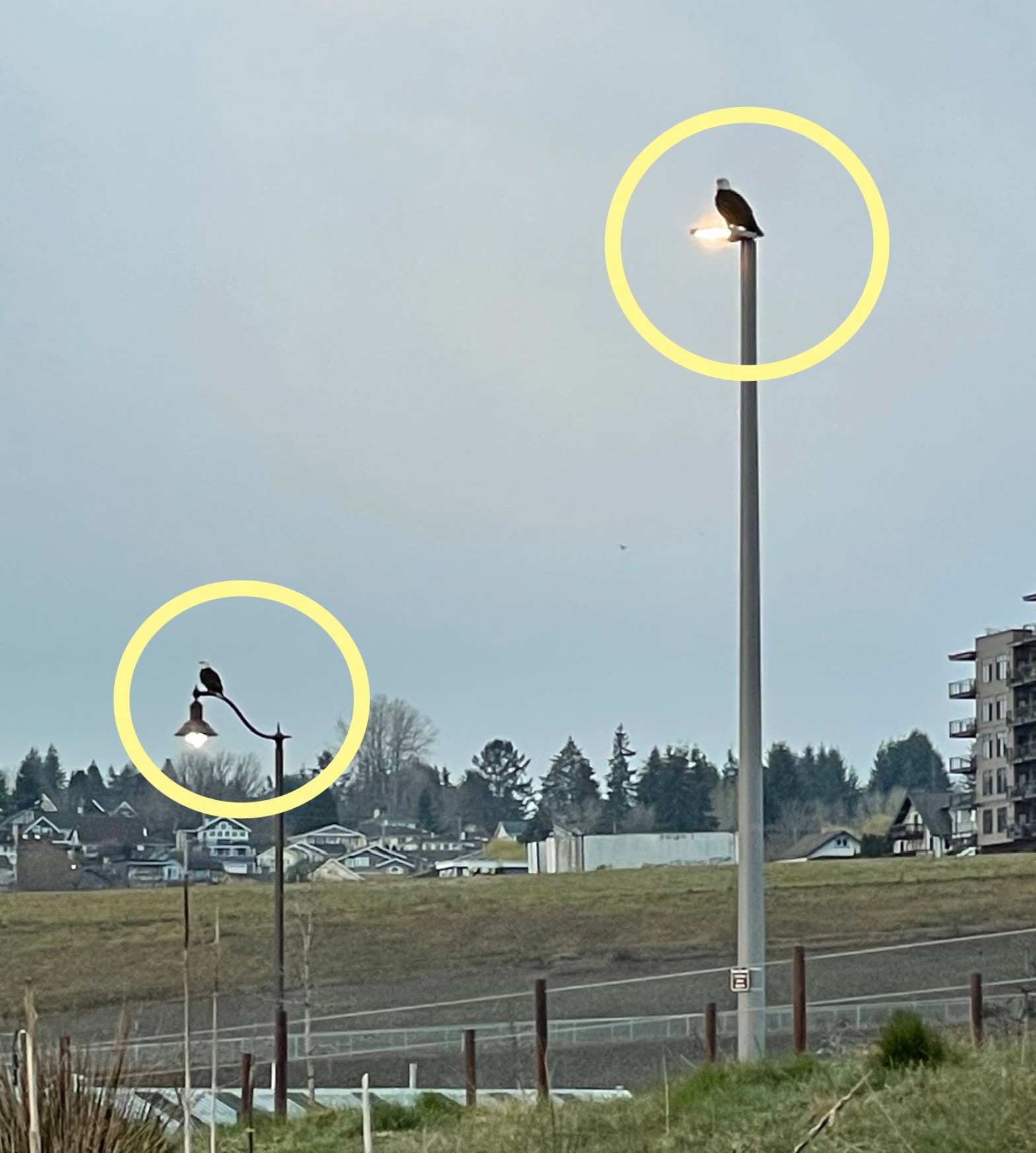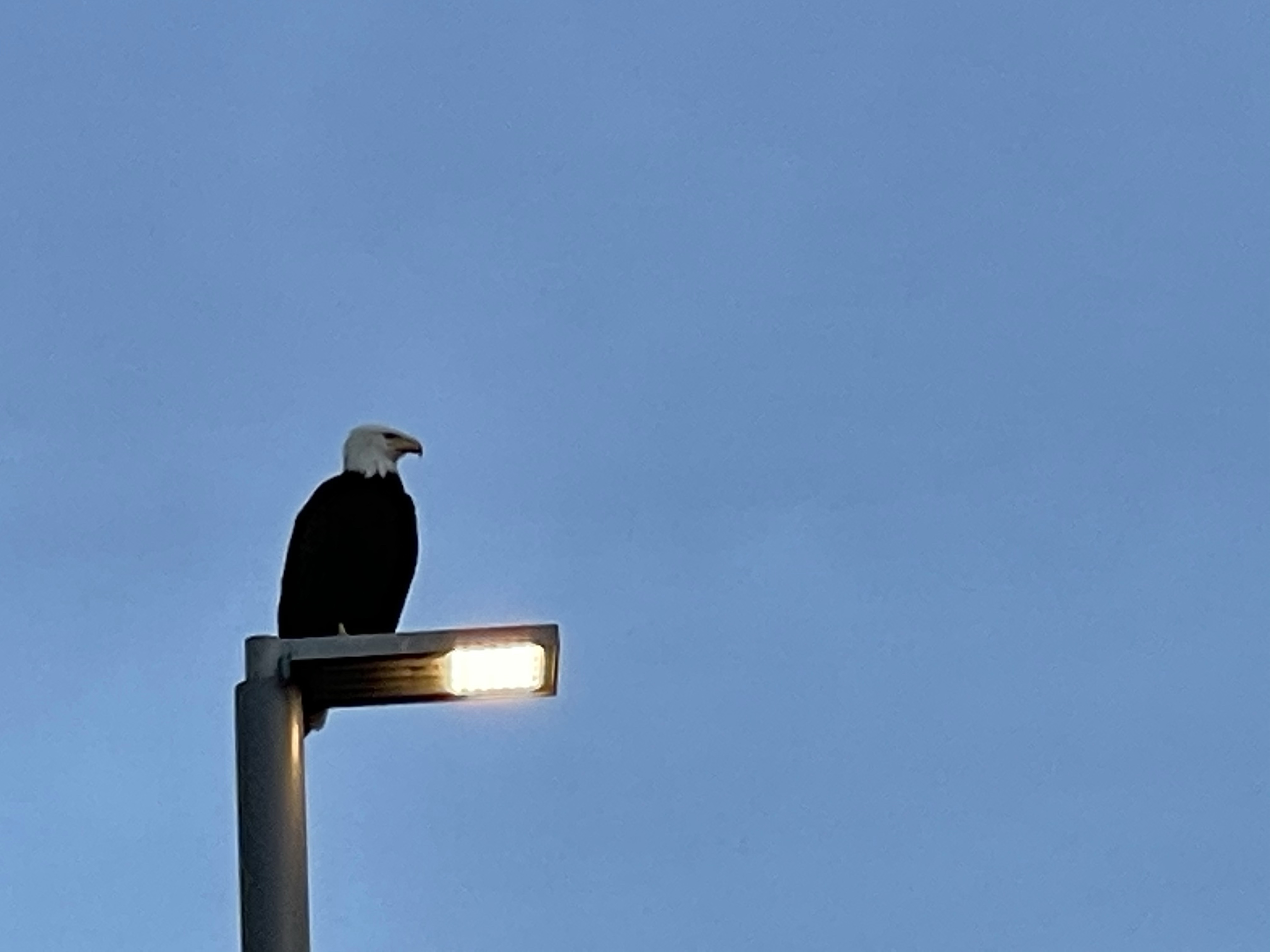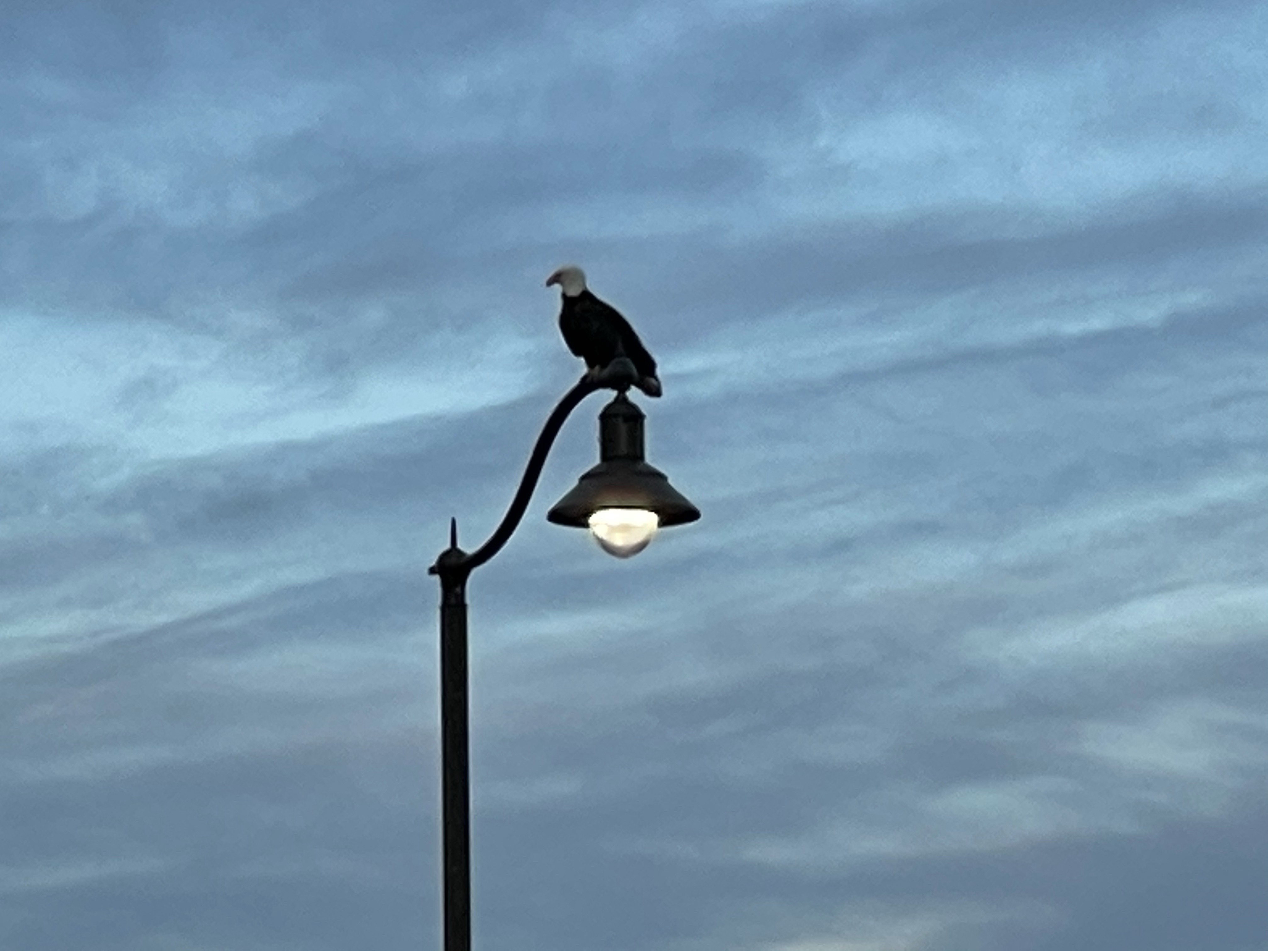 On this morning’s walk, my husband Mark and I saw a juvenile bald eagle land on a lamppost at Dune Peninsula Park. It’s wingspan was huge.