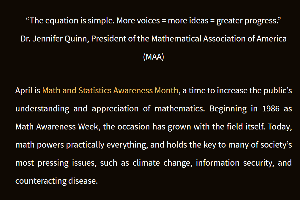 To learn more about Mathematics and Statistics Awareness Month visit https://ww2.amstat.org/mathstatmonth/.