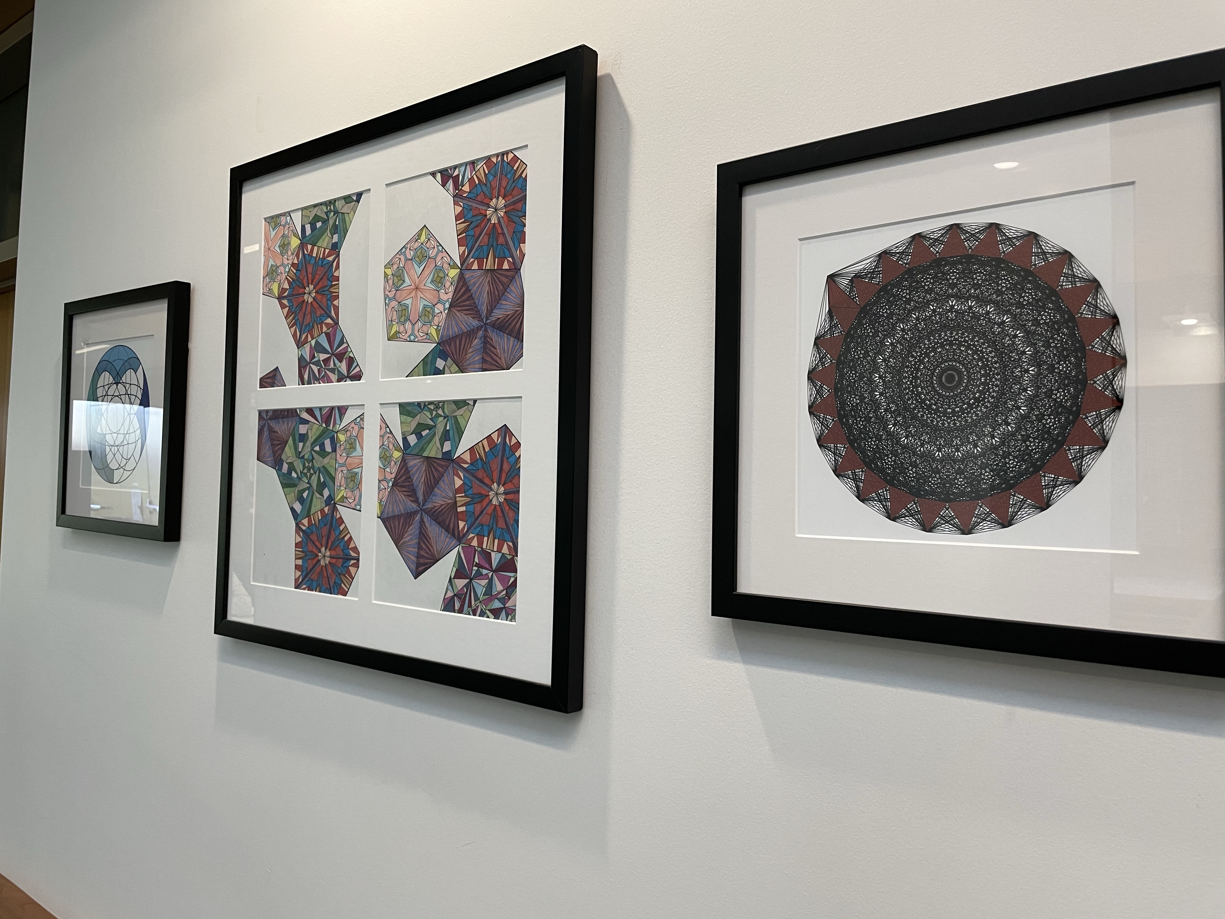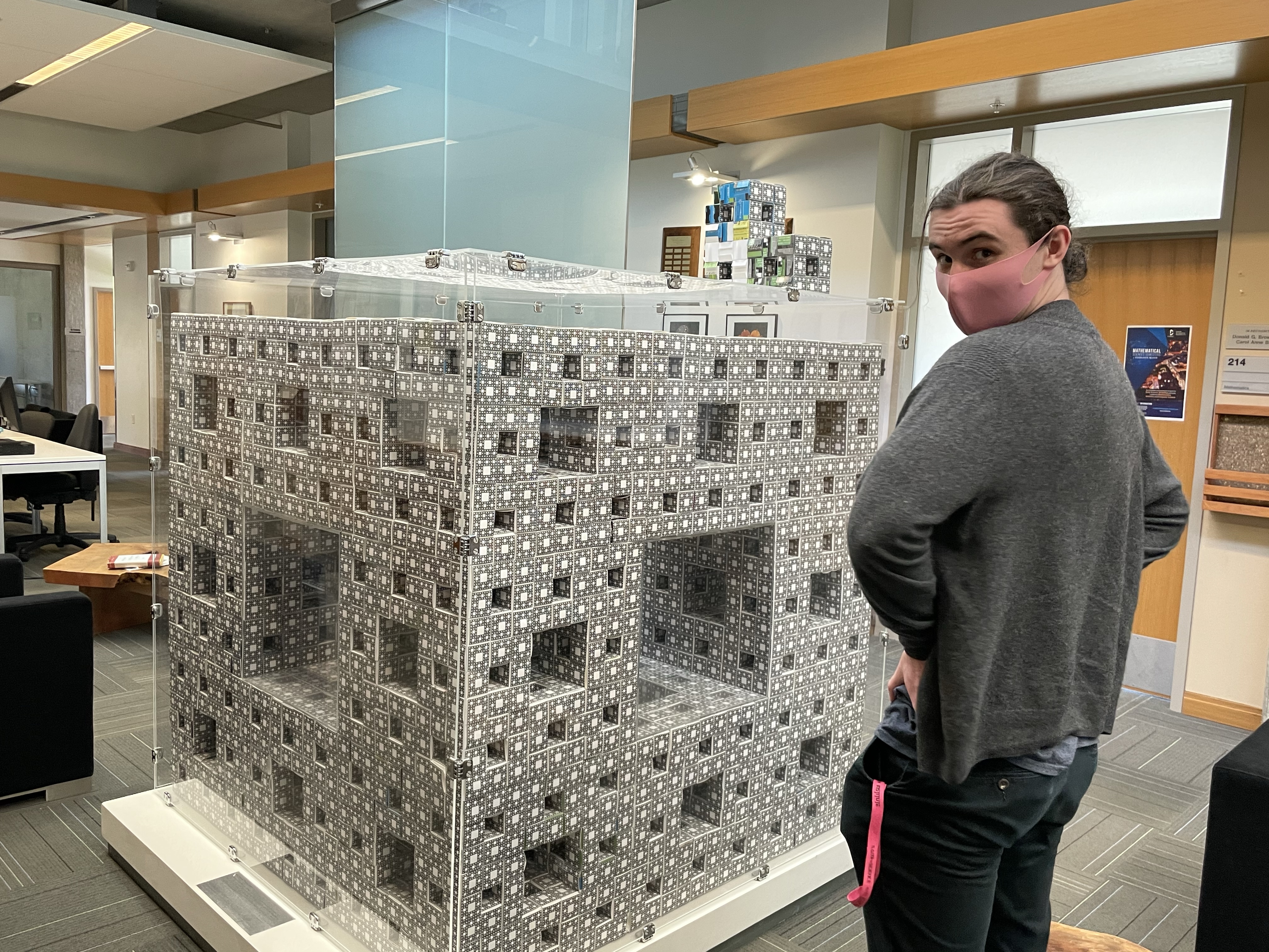 Next we visited campus and talked with a friend (thanks Josh Laison), had a private tour (and even got into several buildings including Sciences, Math, and Music), and also talked with a current student with similar interests (Thanks again Josh. Seth was great.) We got to see the original piece of art that is on the cover of this month’s Math Horizon magazine and the MegaMenger Sponge.