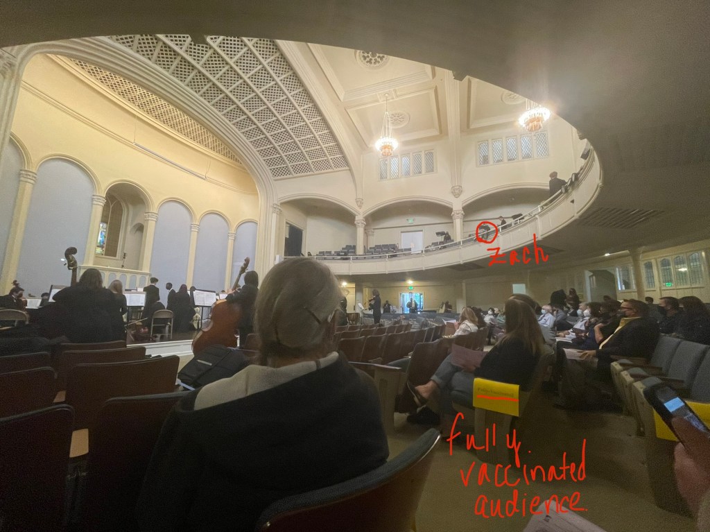 TYS rehearsed remotely for more than a year. The students had two 1-hour in-person practices before today’s performance. It was remarkable what they achieved. The performance was different than anything we have been to in the past. Strings were spread out on the stage with their backs to the audience. Wind woods and brass were spread out in the mezzanine. The audience was underneath. We positioned ourselves on the left side of the room so we could see our flautist above us. (I played the livestream of the event to my phone with no sound to be able to see the faces of the performers.)