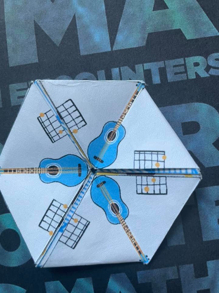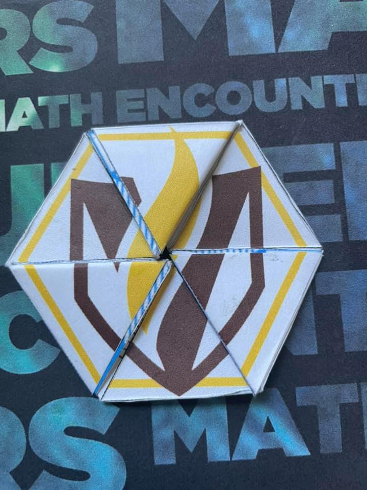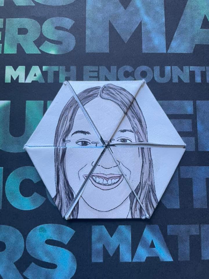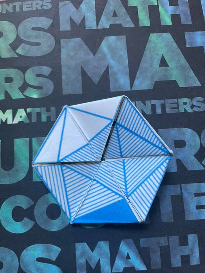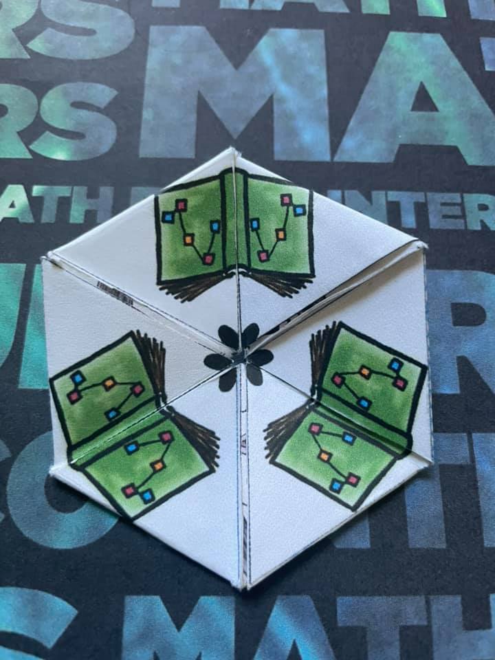 The artwork is my own but the design was inspired by Robin Moseley and the site www.flexagon.net. (I used hexahexaflexagon variation 3/3.) This introduction was only possible because we were virtual. First I would have to be in NYC, 2900 miles away. And second, I would need a document camera to project the flexing. (Admittedly, I have learned to use my cell phone as a doc cam this past year. I suppose the same technique could work when travelling.)