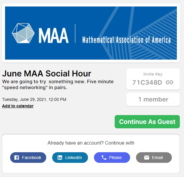 Overall, this was fun. There were great (and MAA knowledgeable) people to talk with. It really felt like wandering the aisles of the exhibit hall at the summer meeting and running into friends. The bonus for me was the 5 minute limit. I am terrible at ending conversations. Glimpse gives fair warning and your conversation partner just fades away in the last 10 seconds.