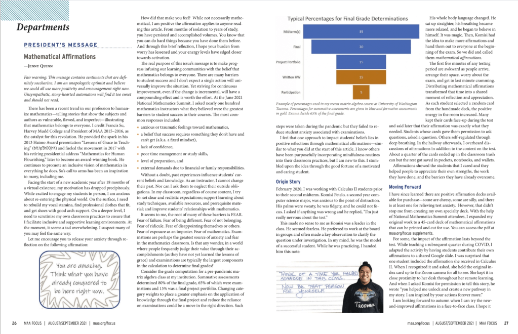 I admit, I was grumpy and feeling down yesterday. But I bounced back after seeing the newest issue of MAA Focus released online. The President’s message that I wrote was about using affirmations to help students address mathematical anxiety, especially associated with assessments. Reading it again, helped relieve my own anxiety of the moment. Even the initial reflection: