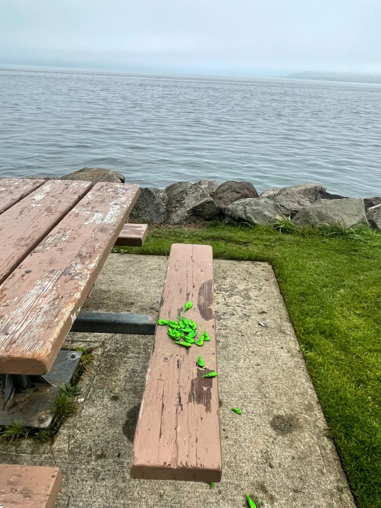 During my morning walk along the waterfront, I passed by what looked like green Cheetos dumped onto a park bench. I didn’t think much of it until I looked more closely.
