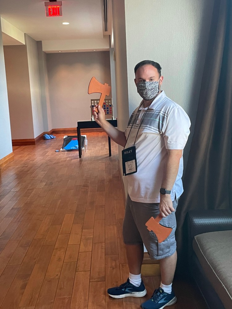 Afterwards, I reconnected with Dave Taylor and we checked out the AMATYC Hospitality suite. There was nerf axe throwing and cornhole–but not in a competitive way. I love the joy and play that is built into this meeting.