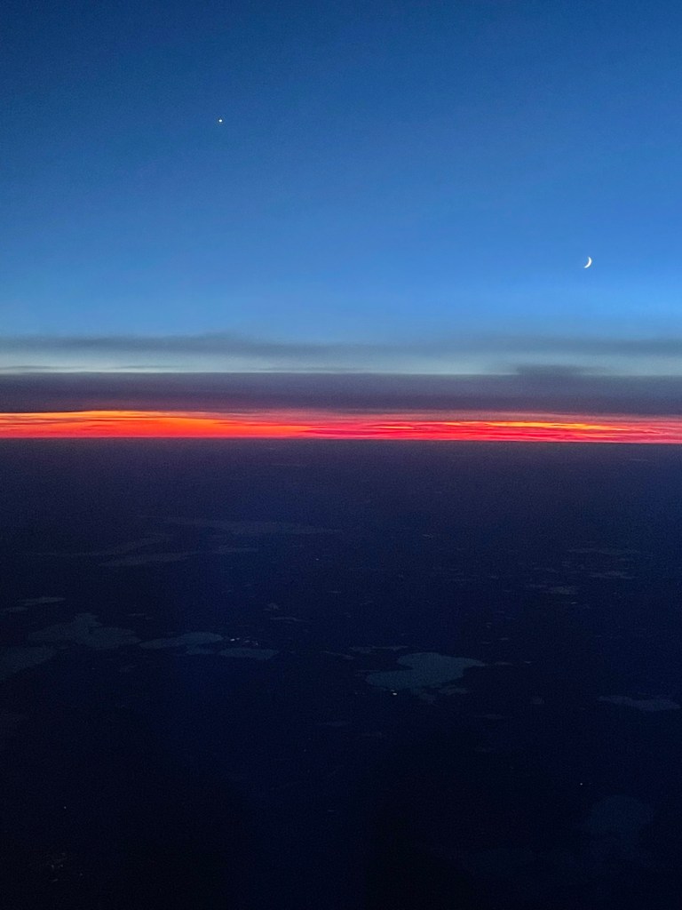 Despite every fiber of my being crying out for me to do so, I did not succumb until after I boarded the plane. Suffice it to say, the flight went by quickly because I crashed. Hard. I woke up somewhere over Minnesota to see the sunset and promptly returned to slumber.