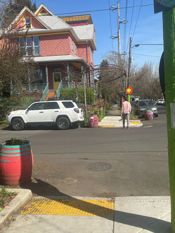 Taking a break from grading, my husband and I drove down to Salem, OR to pick-up our youngest from his first semester at college. On the way, we stopped by Sunnyside Piazza because I wanted to see its new intersection art.
