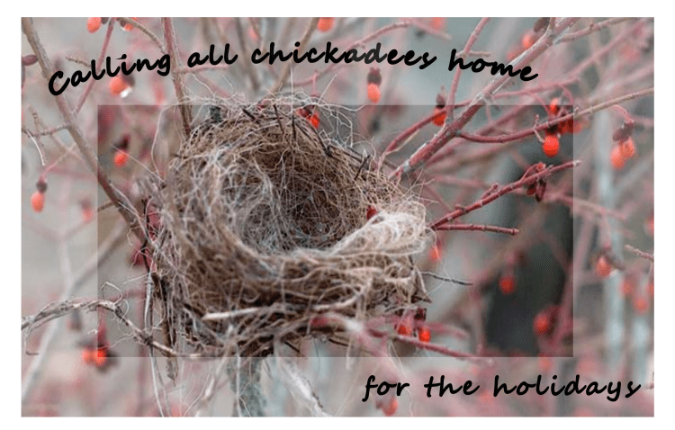 The cover was inspired by Mark and my newly empty nest and the fact that my Mom always refers to the ones she loves as chickadees.