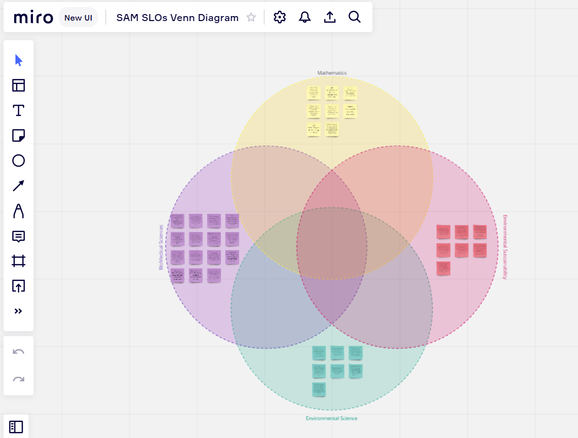 After today’s assessment work group meeting, I created this activity to prepare for our next discussion. The circles represent the four majors in the Science and Math (SAM) Division of the School of Interdisciplinary Arts and Sciences at the University of Washington Tacoma. Each Post-It note contains one student learning outcome (SLO) color-coded by major. As you might expect, there is a fair amount of overlap between these sciences and math majors. Our task will be to drag the SLO stickies to the appropriate region of overlap. The items in the middle will form the central values for the Division.