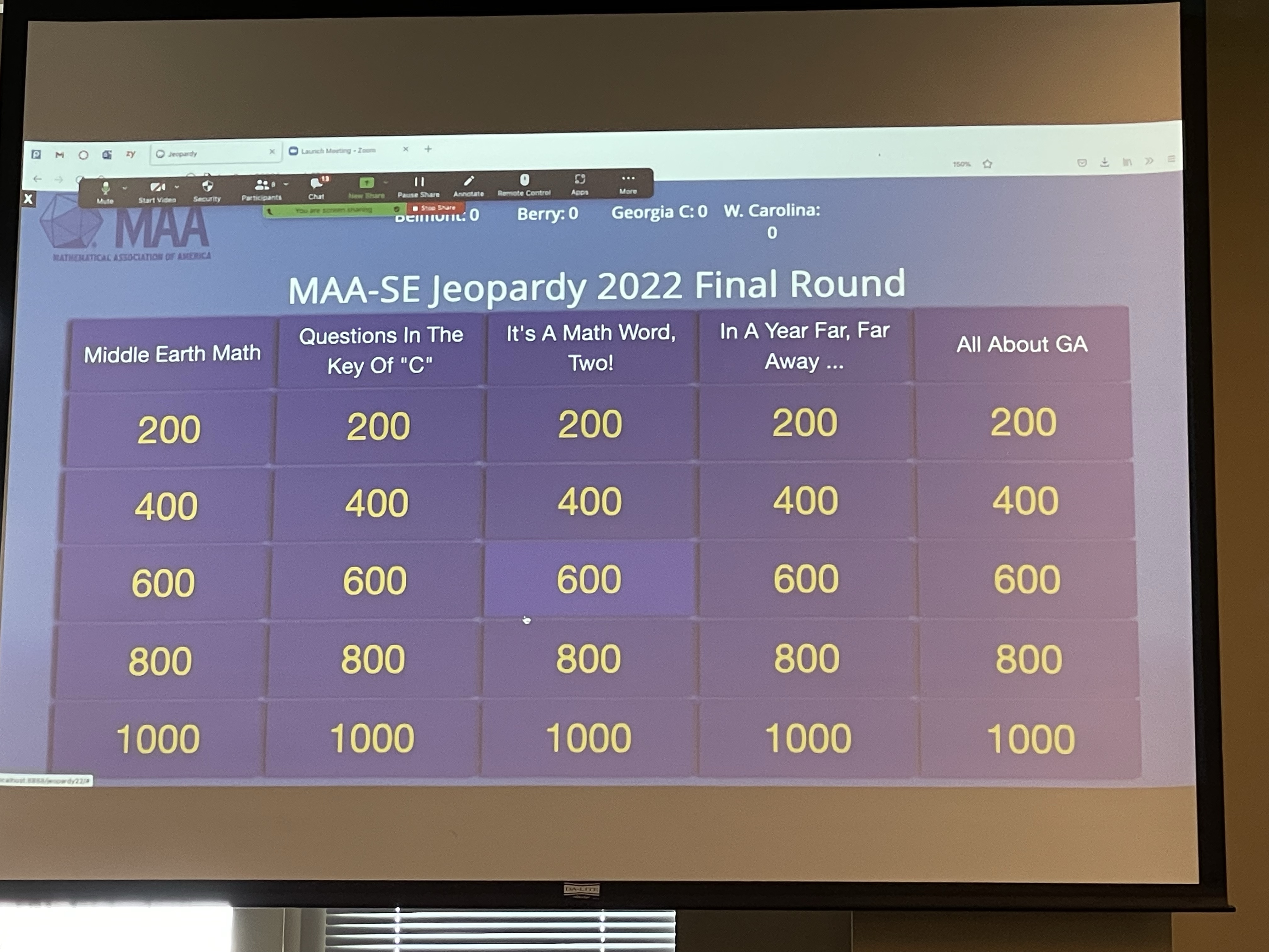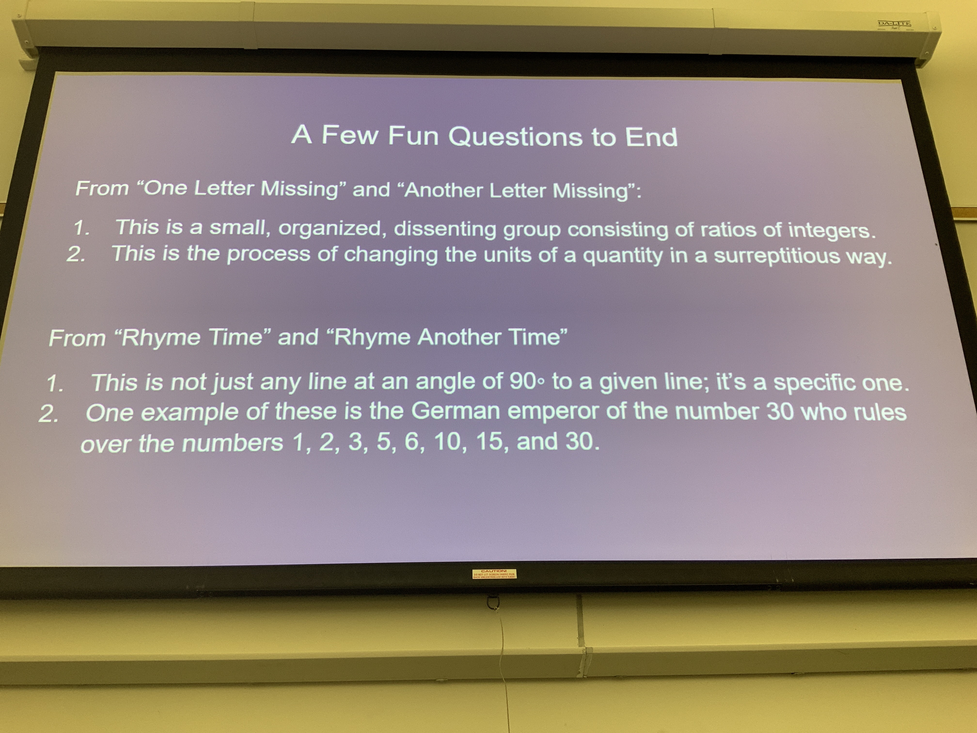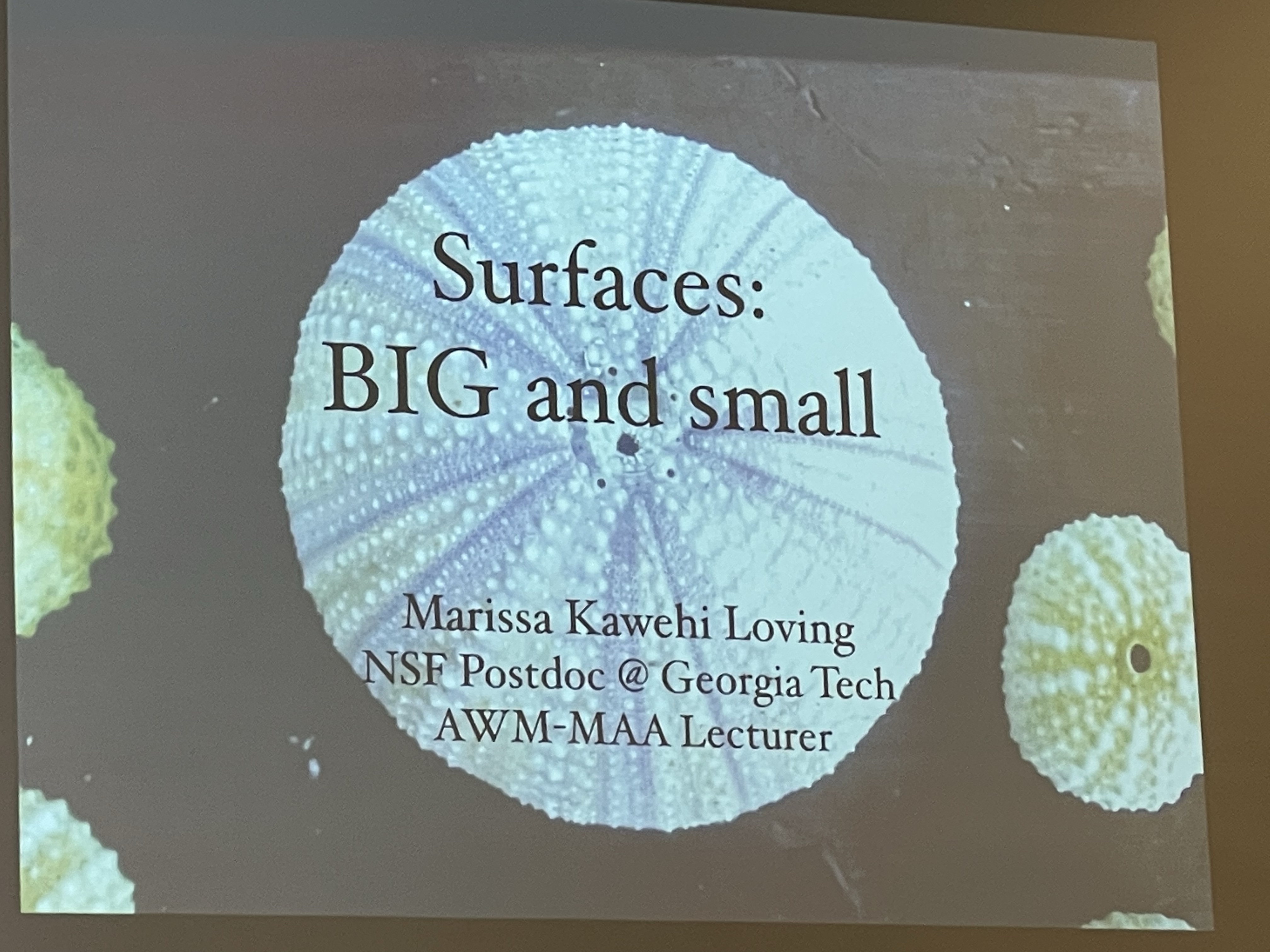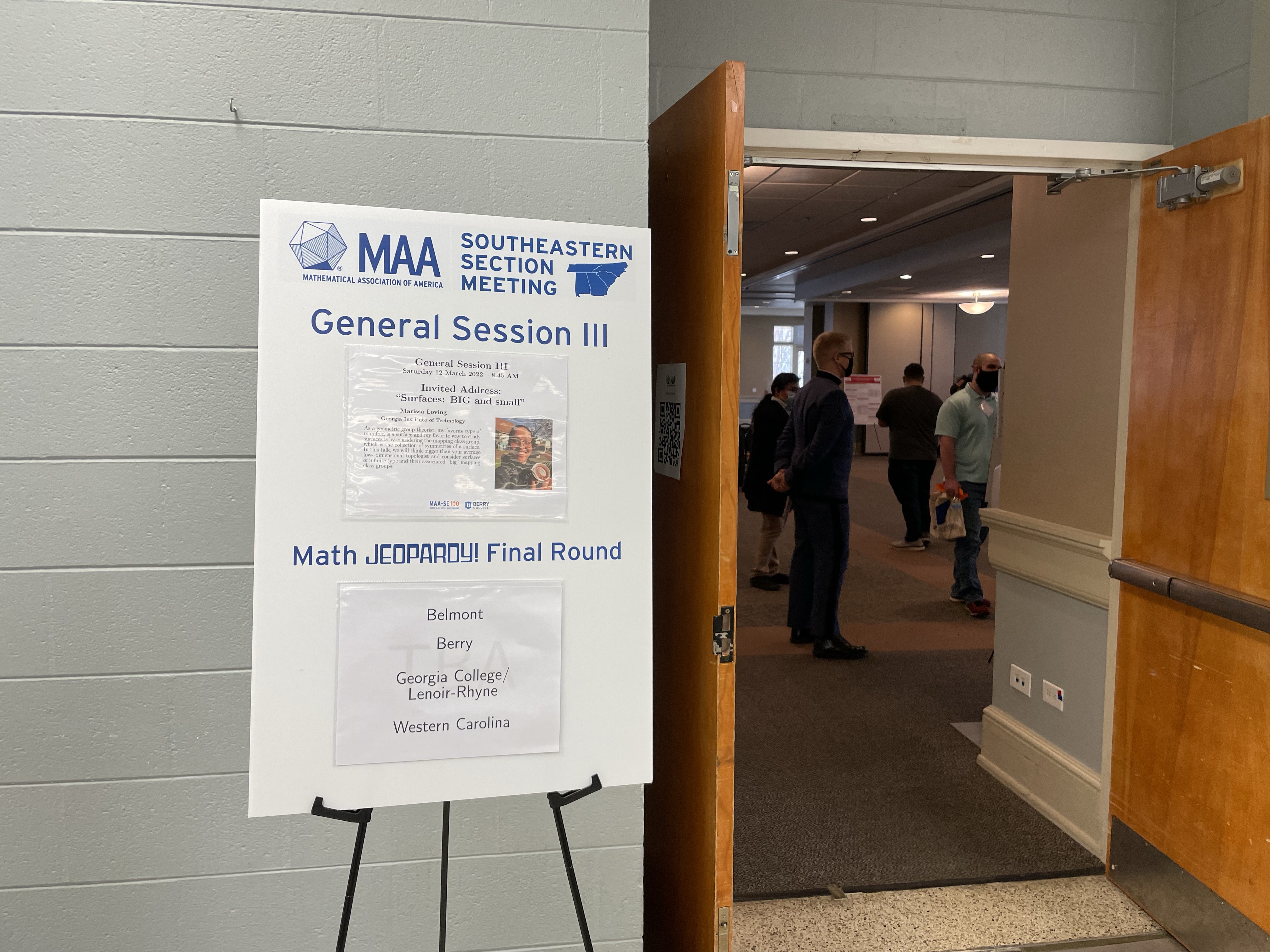 I think my talks went well. I enjoyed everything I attended from the Happy Hundredth: Celebrating the Southeastern Section Centennial session to the Princess Bride inspired session You Keep Using That Word, from Marissa Loving’s MAA/AWM Section lecture Surfaces: BIG and Big and small to the finals of the Jeopardy! Competition.
