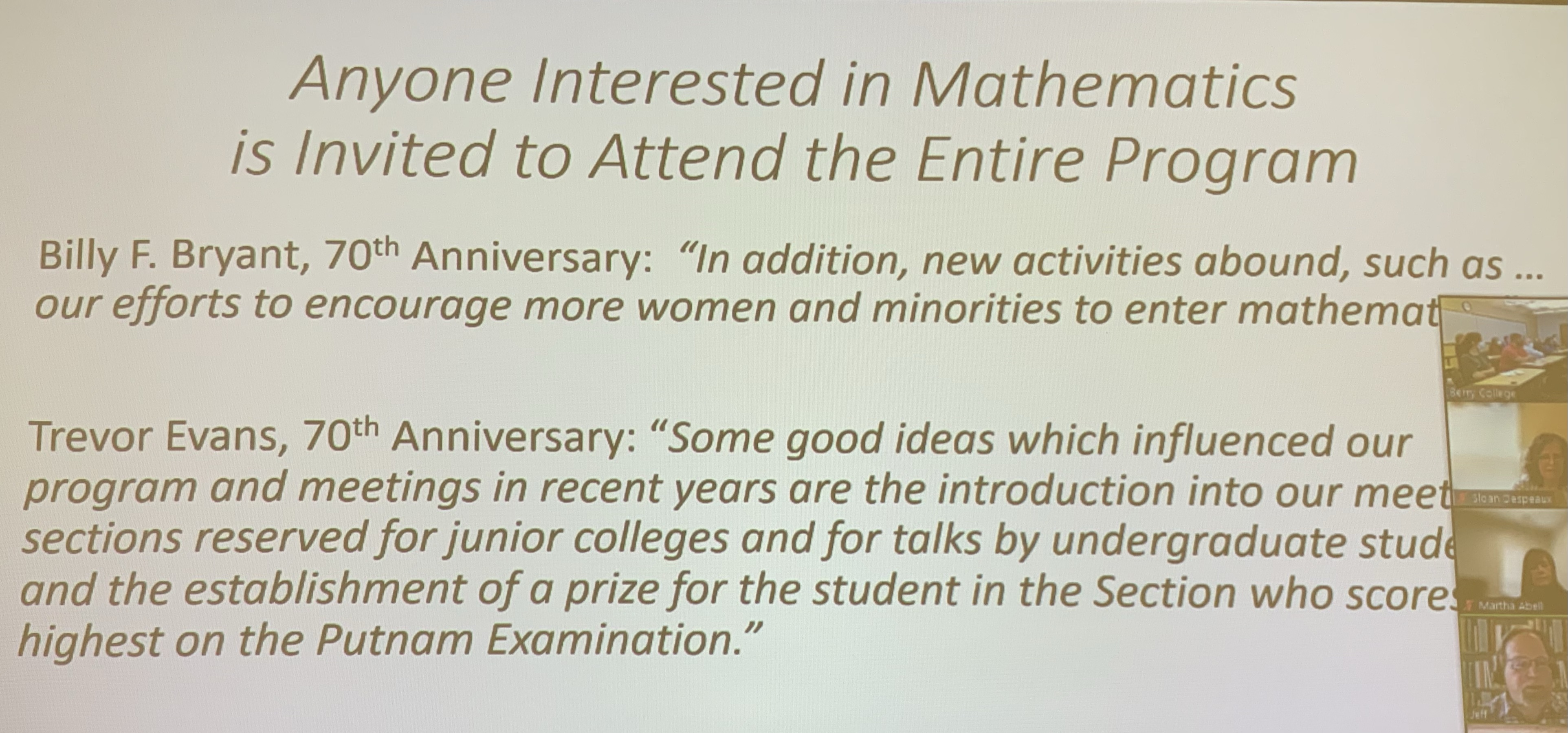 Congratulations to the MAA SE Section on their Centennial. It was an honor to celebrate this milestone at their Spring 2022 meeting hosted by Berry College.