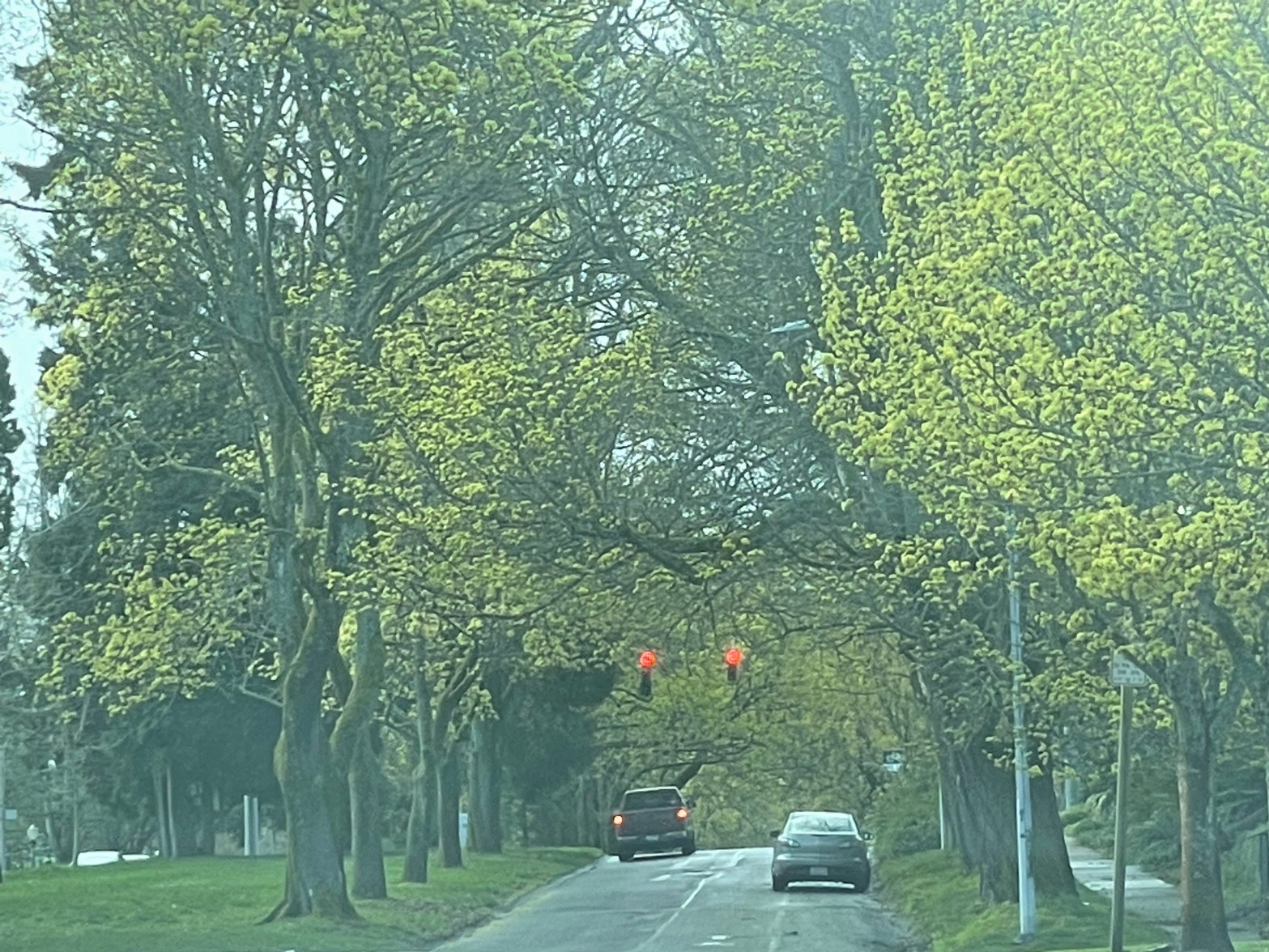 Trees along the boulevard are blooming. The color is the chartreuse of new growth that is only found at the start of Spring.