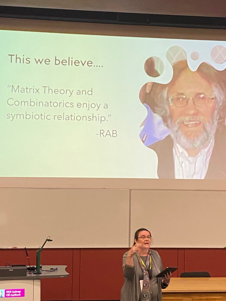I was the penultimate speaker. Using the AirPlay feature, I cast my presentation from my iPad to the projector. I used my finger as a pointer, could write on the slides, and never had to turn my back on the audience. Revisiting the lessons from the first half of the minisymposium, I added my own observations—namely the importance of exposition. Richard and I co-wrote the article “Some applications of elementary linear algebra in combinatorics,” published in the College Math Journal (1993) that started my fruitful association with MAA publications and the MAA in general.