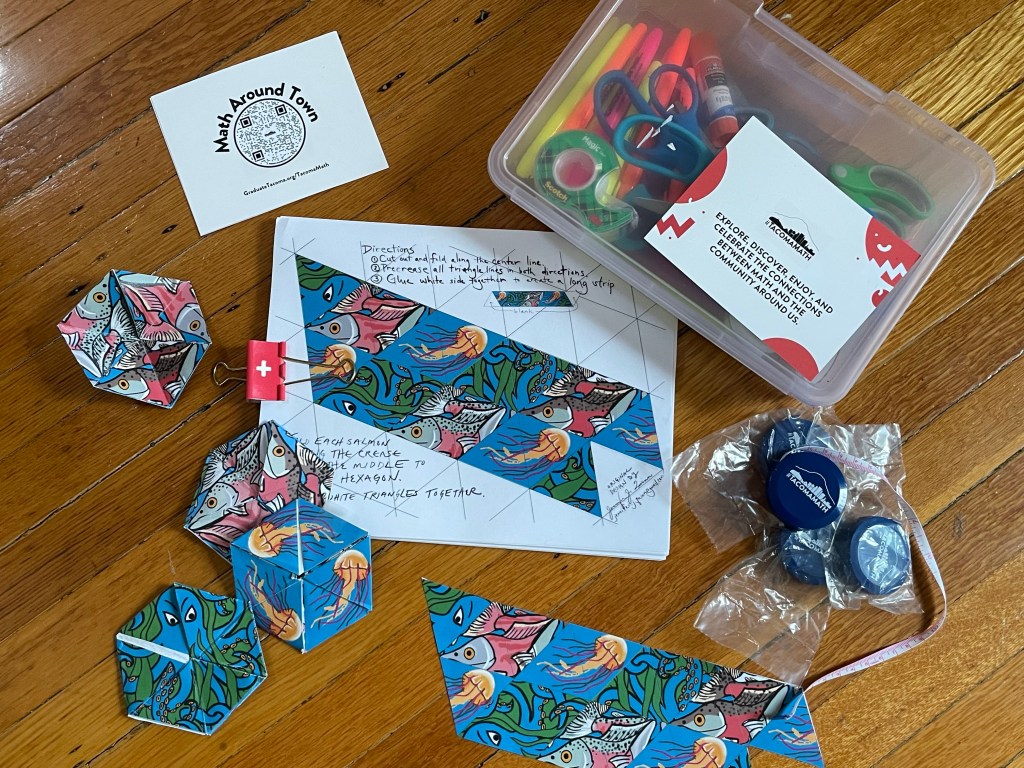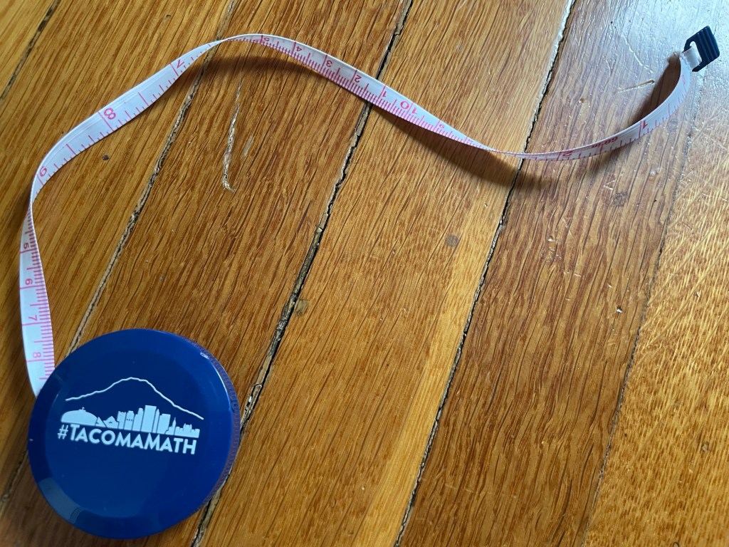 At the table we distributed tape measures and #TacomaMath postcards with links to the Math Around Town YouTube Playlist. There was a hexaflexagon paper craft. And (thanks to Allison Henrich’s lecture at MathFest 2022) I used some rope tricks to engage shy younglings in conversation at the table.