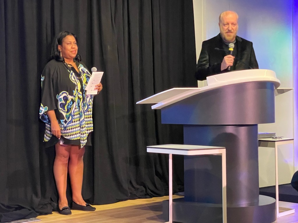 A social hour in the Jane Street cafeteria was followed by a formal program of celebration. It was my honor to emcee. In Young Cho, a Jane Street trader, welcomed the celebrants with her own stories friendships formed during mathematics competitions. She ended her welcome with wise words from her HS alma mater, “Goodness without knowledge… is weak and feeble, yet knowledge without goodness is dangerous….” She urged the winners to work hard and use their intellectual gifts for good.