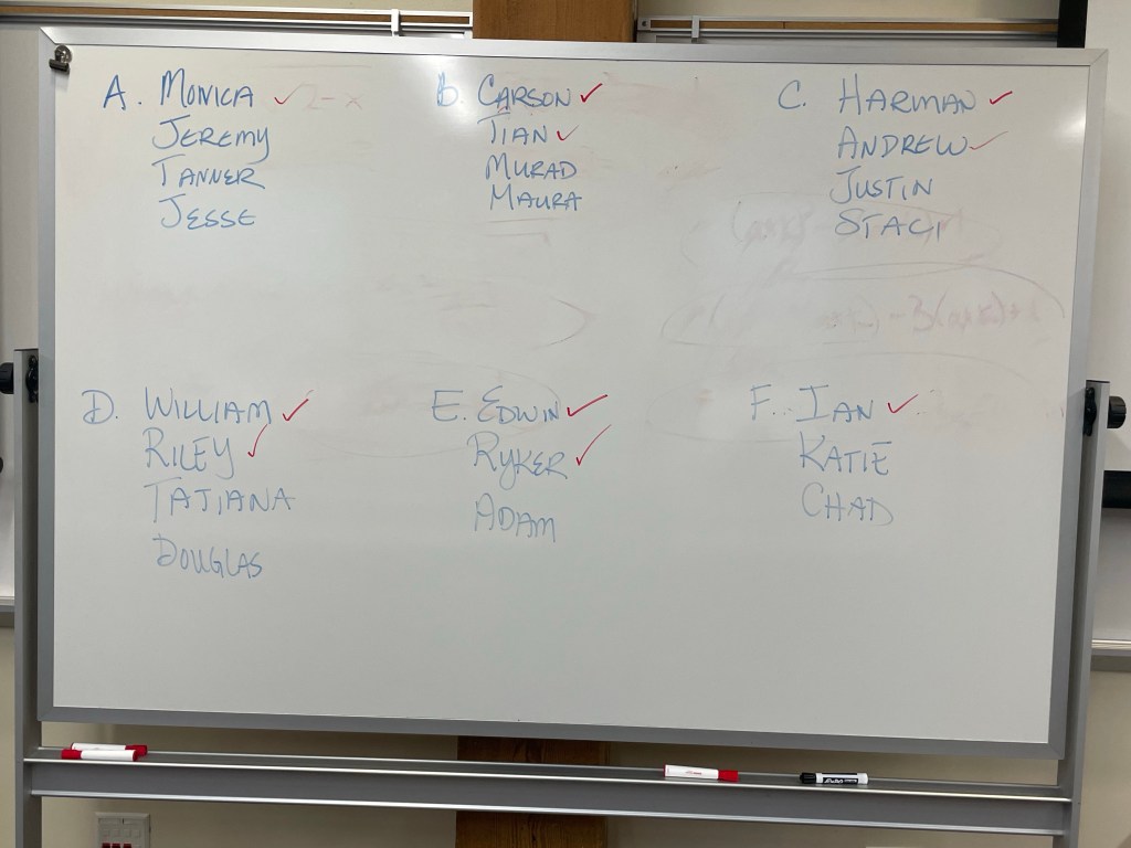 I am again using the randomly generated lists to call on students rather than asking for volunteers. They know the order in advance and can mentally prepare for their turn. I distributed the list on the class Discord server, figuring at least one person in each group will have access if needed, and I wrote it on the whiteboard.