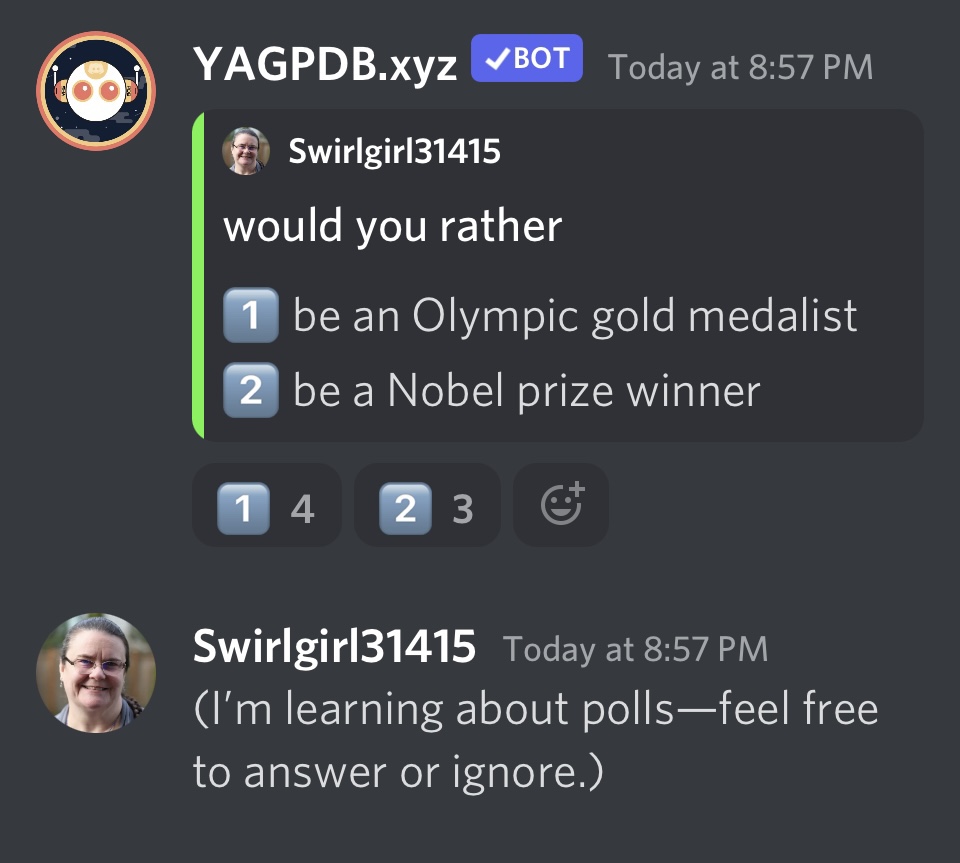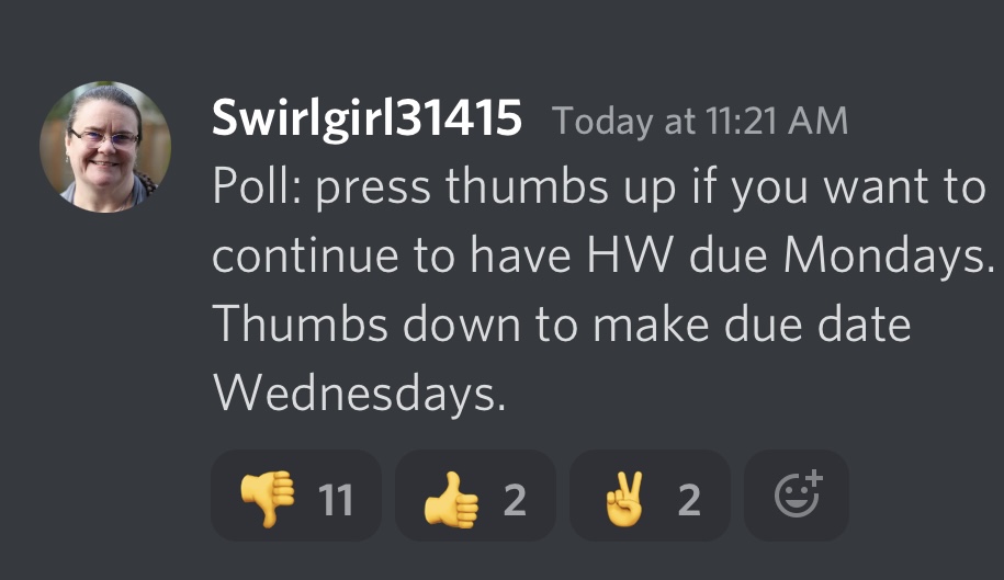 Today I wanted to poll the class and thought, “I bet I can do that on Discord.” I googled “how do I create a Discord poll?” and got a simple solution using emojis.